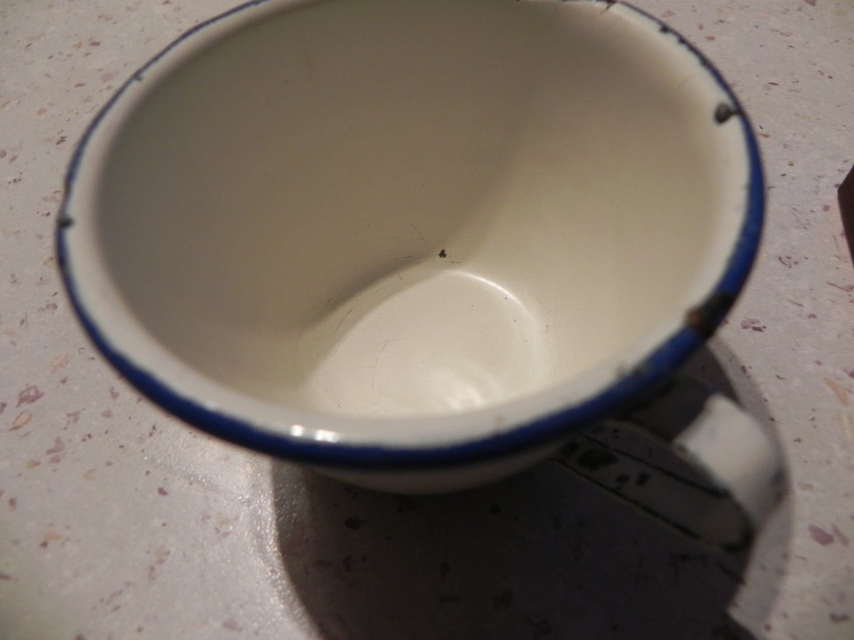 Для СССР вроде слишком изящна и смущает голубая каемка. Чердак. Толстый метал. Ручка вроде припаяна. Клейм нет. Пригодна вполне попить кофе.