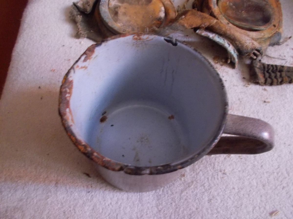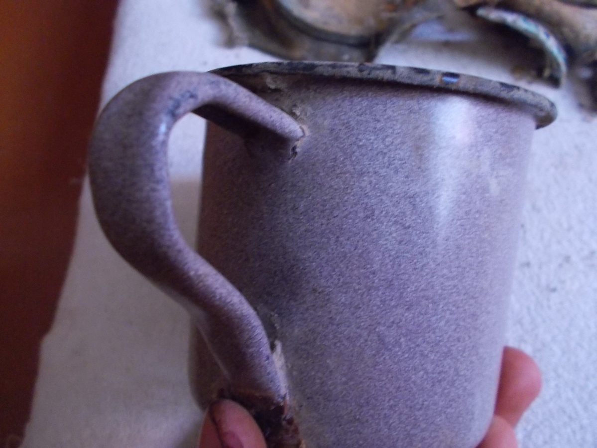 Доброго вечора! Кружка піднята з пів метрової глибини, трохи заїхав лопатою, видно на фото. Не дірява 100%. Щось вартує? Обговорюється тут https://reibert.info/threads/kruzhka.808758/