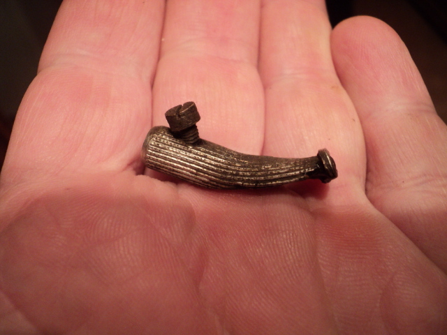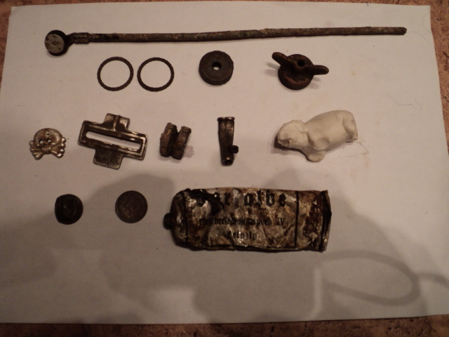 Вот сегодня помимо гильз, пуговиц и крупных вещиц нарыл. Что за кружок с надписями? Тюбик с мазью поврежден лопатой. На фото 4-5 непонятка с винтом. На шестом круглая гайка может от динамика велосипеда. На седьмом шайбы с рифлением найдены рядом. Что за клеймо на крючке на последнем фото? Находил крючок ранее без клейма. И о других подскажите.