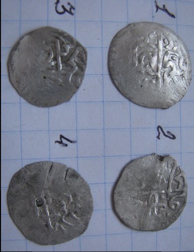 Здравствуйте уважаемые знатоки. Прошу атрибутировать монеты, насколько редки. Материал серебро. Вес 1 - 0.73 грм., 2 - 0.82 грм., 3 - 0.71грм., 4 - 0.65 грм. Всего поднято 45 монет. Из сопутки кресало.
