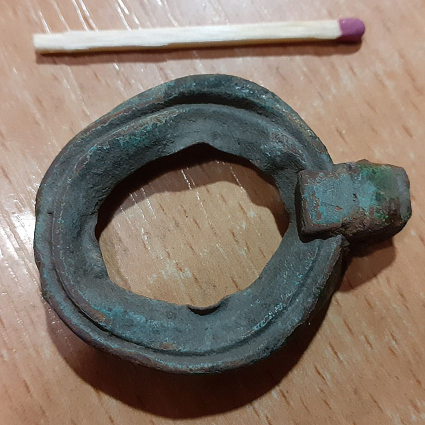 Добрый вечер! Поднял такое. Возможно, есть какие либо предположения от чего? Материал - вроде латунь. Сцарапал патину - там ярко желтый металл. Почему сверху есть патина зеленого цвета - хз. Возможно оно обмеднено? Как видно, там пружинка была в ушке. Т.е. что то открывалось / закрывалось. Что в окошке? Возможно...стеклышко было? Период - советы? Империя? Как по Вашему?
