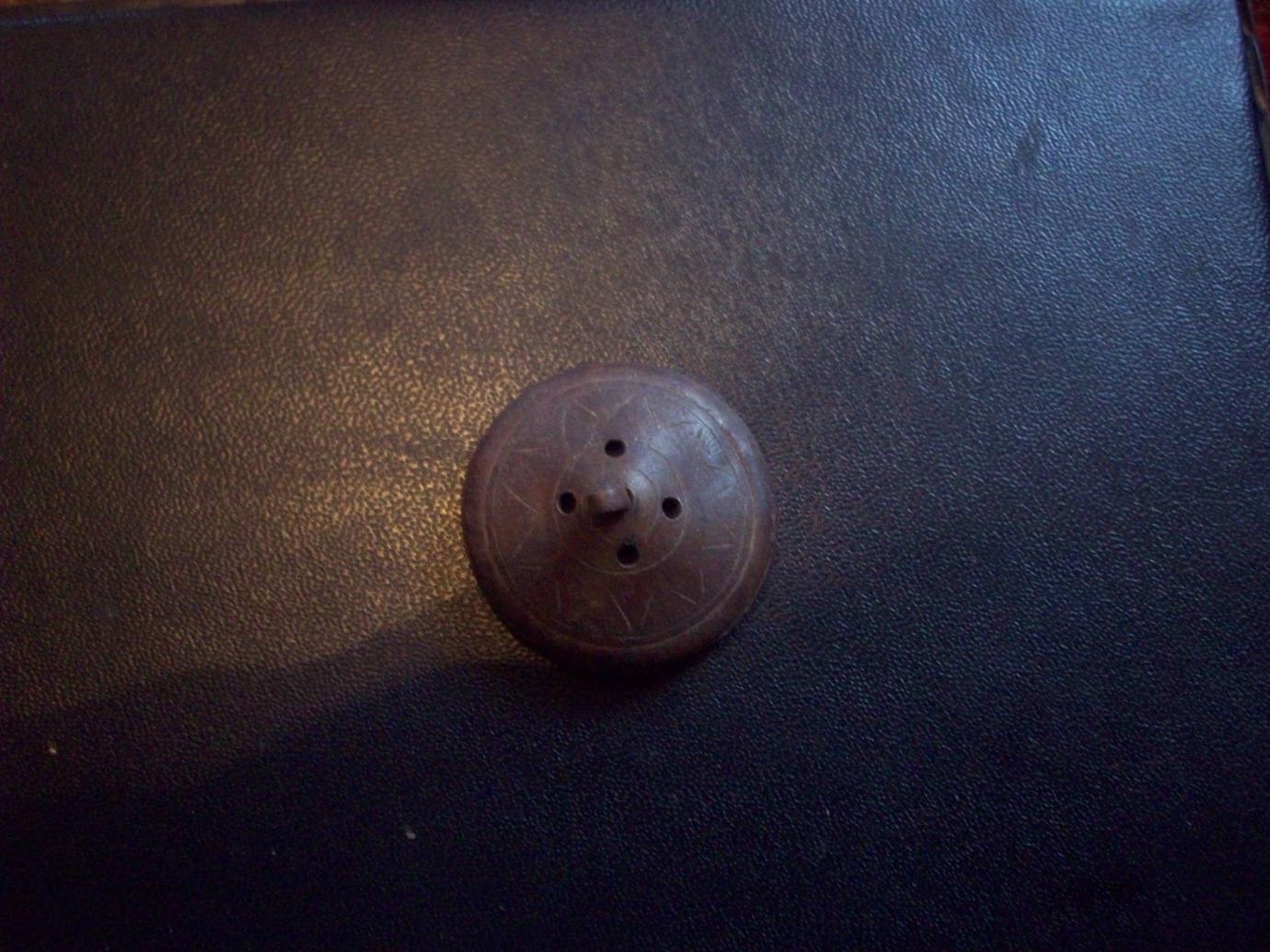 Помогите определить, давно мучаюсь. Много лет назад, выкопал случайно в лесостепи, какую то крышечку. Размер - с пятак (советский). На верху, есть фиговинка, для держания. Орнамент непонятный и дырочки зачем ? За ответы - спасибо.