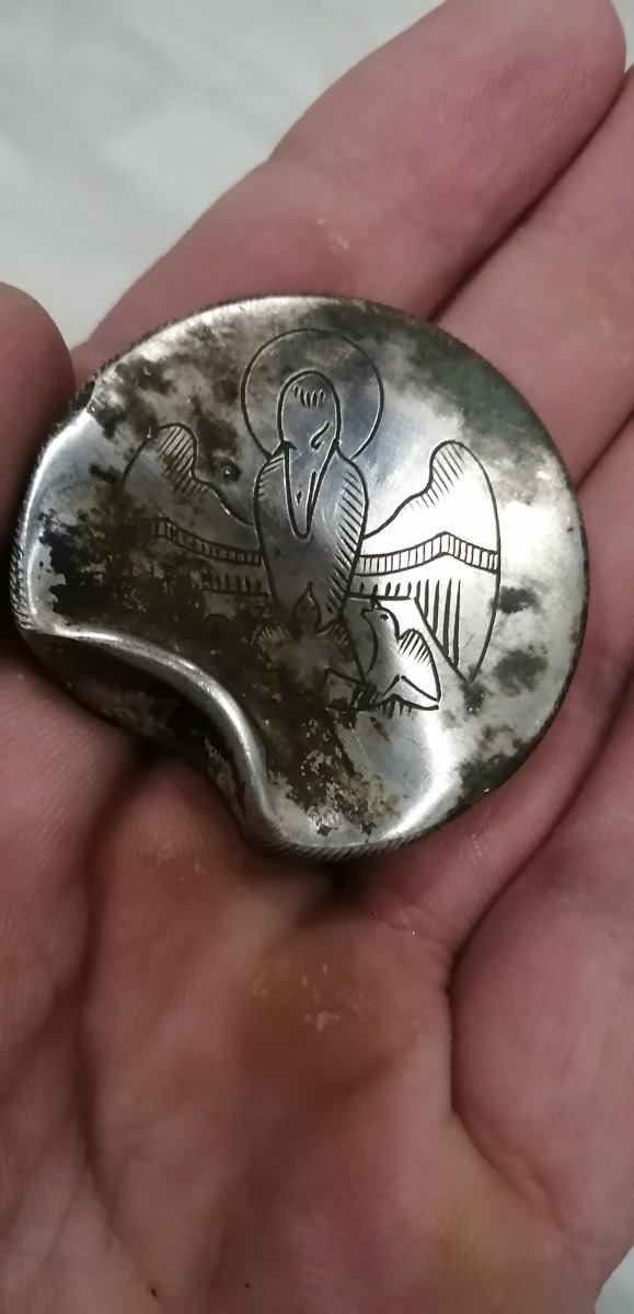 В середньовіччі цей символ часто зображали на дверцятах табернакля ( місце де зберігалися гостії ). Кругла форма дає підстави міркувати, що ця кришка від баночки де зберігалися гостії та належала капелану Вермахта. з повагою