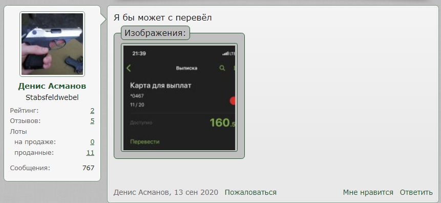 А по сути: Вел переписку с человеком 1,5 месяца не мог получить нужный размер, типа " Я не на месте" потом выяснил наконец размер и попросил реквизиты, сделал оплату и жду ответа, типа номер ТТН такой то или отправлю завтра и все в этом роде, но нет человек пропал, на сообщения не отвечает, хотя читает, потом ответил, через неделю будет, ждите, прошла неделя, вторая, третья, тишина, отписываюсь, как дела? прочитал и молчит, опять спрашиваю, когда? ответ "форс мажор", потом типа " Я уехал" ждите. Потом на запрос - ответ, какой то дядя владелец -продавец товара, что то перепутал не туда отправил и тому подобный бред, мне надоело и Я сказал, отбой, возврат средств, ответ - у меня денег нет и скрин свой карты, что она типа пустая :)