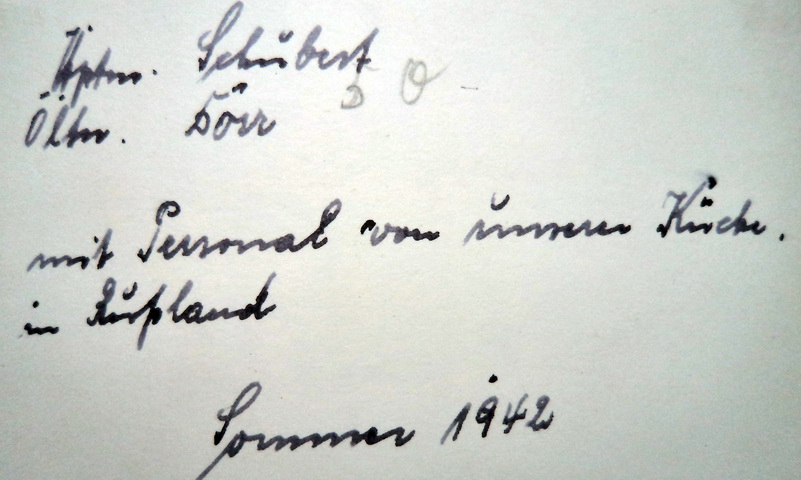 Могу помочь только c переводом. Первое фото: 1) Hptm. Schubert Kompaniechef 2) Oltn.(?) Dörr Stellvertr. Russland 1942 Sommer 1) гауптман Шуберт, командир роты 2) оберлейтенант Дёрр, заместитель Россия 1942 лето Следующее: Hptm. Schubert Oltn. Dörr mit Personal von unserer Küche in Russland Sommer 1942 гауптман Шуберт оберлейтенант Дёрр с персоналом нашей кухни в России лето 1942