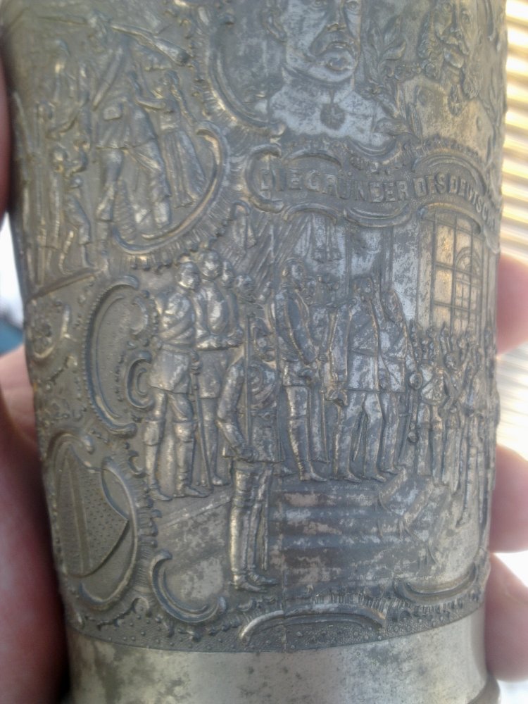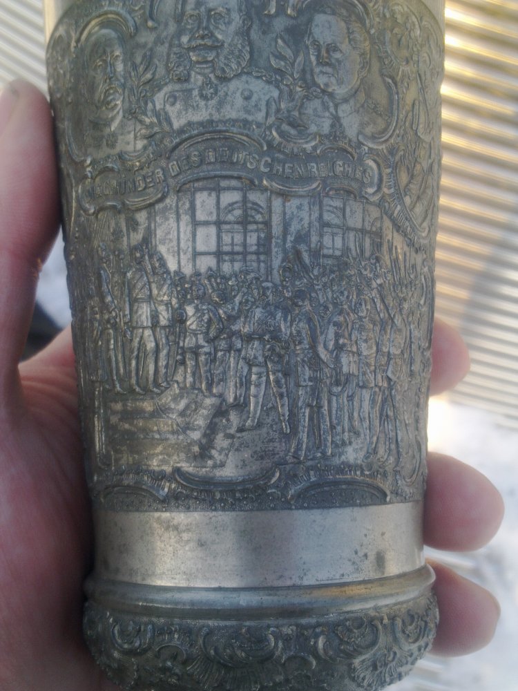 Хорошо выполненный кубок,посвященный провозглашению Германской империи в 1871 году. скорее всего сделан к какому -нибудь юбилею 10-20-30 летию и т.д. по цене соглашусь с Анатолием. Вот похожий http://1939.ru/catalog-2239.html