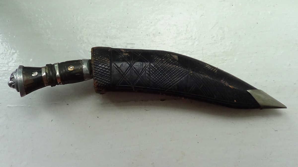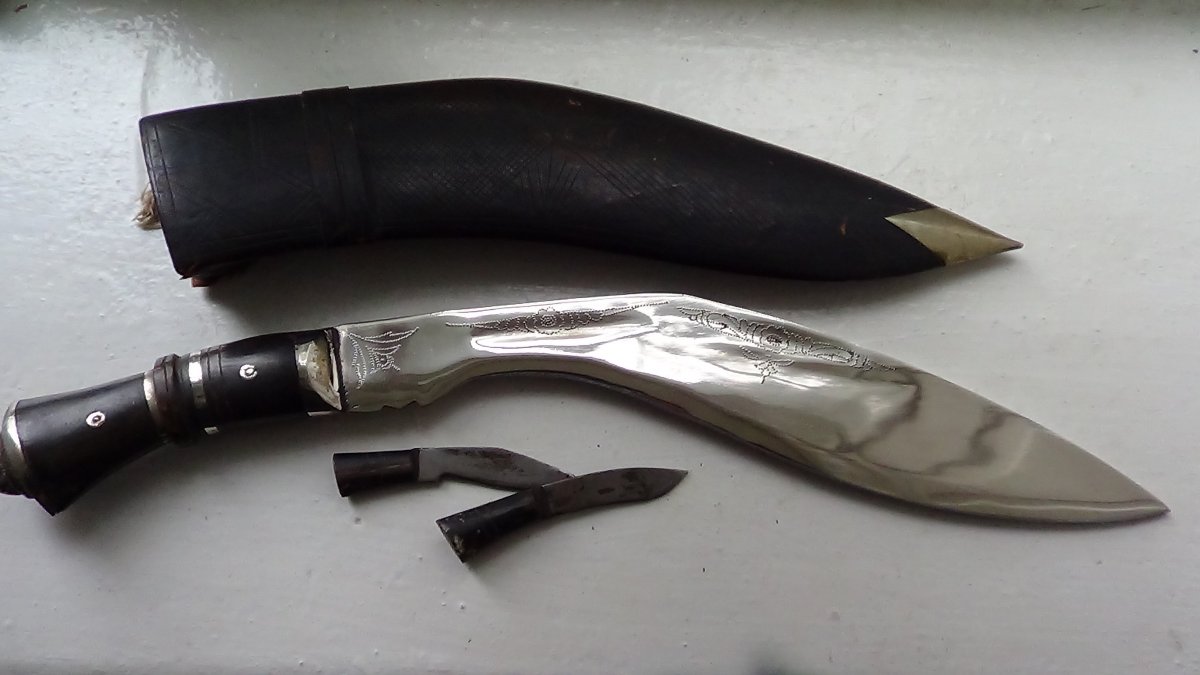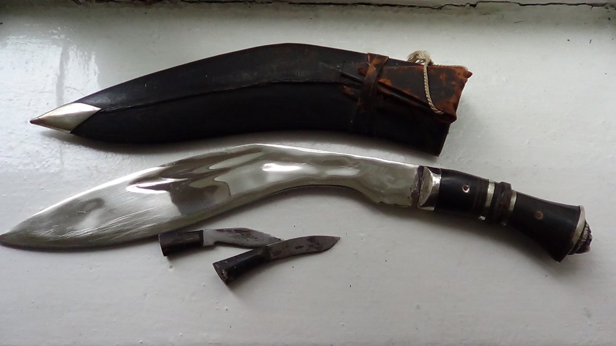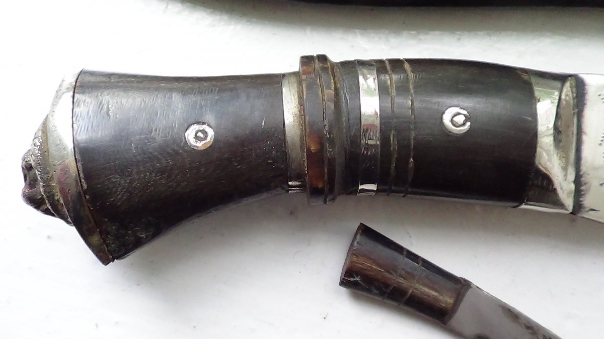 1. рукоять-рог, ножны-кожа водяного буйвола, кованый клинок имеет зонную закалку. общая длинна-21см клинок-13,8см обух-5мм 1250гр. 2. очень большой кукри. такие встречаются крайне редко! красавец! рукоять-рог, ножны-кожа водяного буйвола, кованый клинок имеет зонную закалку. в комплекте два вспомогательных ножичка. один для мелких работ, другой для правки. общая длинна-42см клинок-30см обух-5,5мм очень остро заточен. 1950гр.