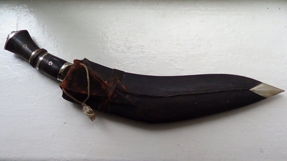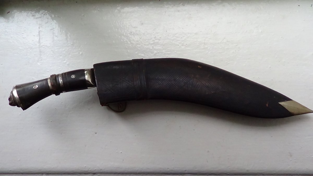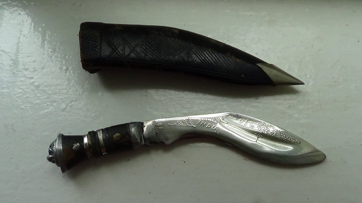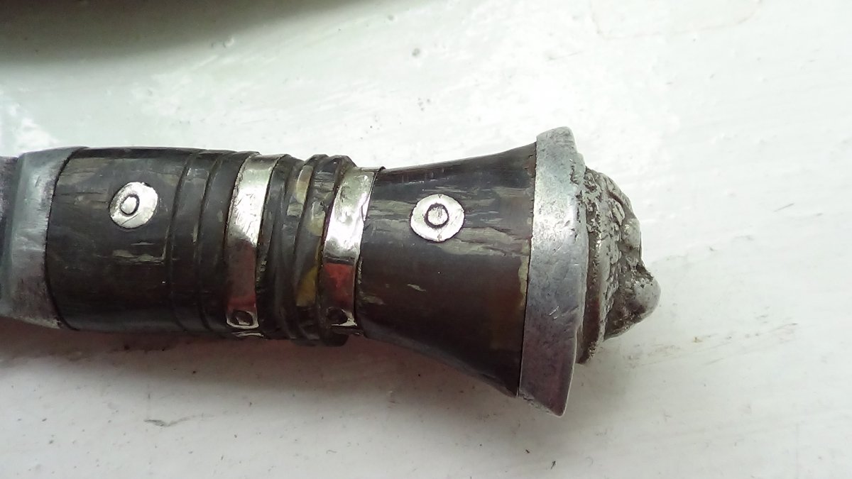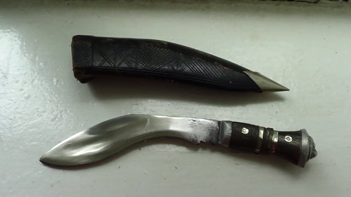 1. рукоять-рог, ножны-кожа водяного буйвола, кованый клинок имеет зонную закалку. общая длинна-21см клинок-13,8см обух-5мм 1250гр. 2. очень большой кукри. такие встречаются крайне редко! красавец! рукоять-рог, ножны-кожа водяного буйвола, кованый клинок имеет зонную закалку. в комплекте два вспомогательных ножичка. один для мелких работ, другой для правки. общая длинна-42см клинок-30см обух-5,5мм очень остро заточен. 1950гр.
