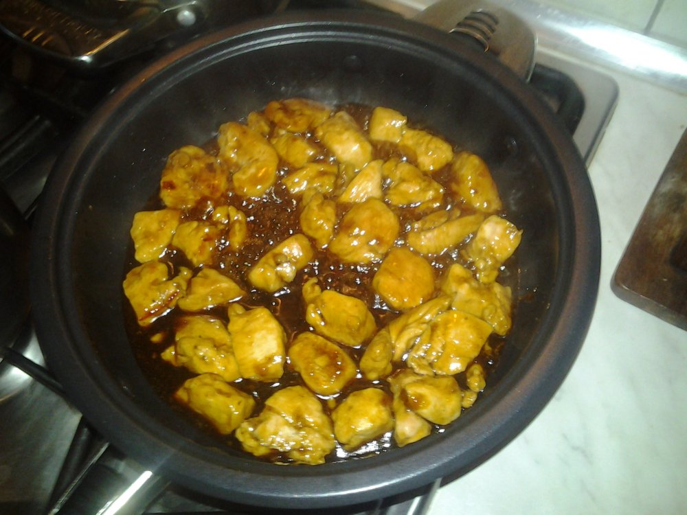 Продолжаю эксперименты. Курица в кисло-сладком (традиционная штука). Берем куриное филе, режем на кусочки (типа "наггетсов"), чуть вываливаем в какой-нибудь "нейтральной" приправе (без соли) по вкусу. Жарим на сковородке без масла (тефлон или вроде того). Как обжарится, добавляем кисло-сладкий соус ("китаец" он обычно, но думаю, сойдет и ткемали, если сахара добавить) + террияки (японский традиционный) + соевый. По вкусу, пробуем. Во всем этом тушится минут 5-7 с помешиванием. Вкусно