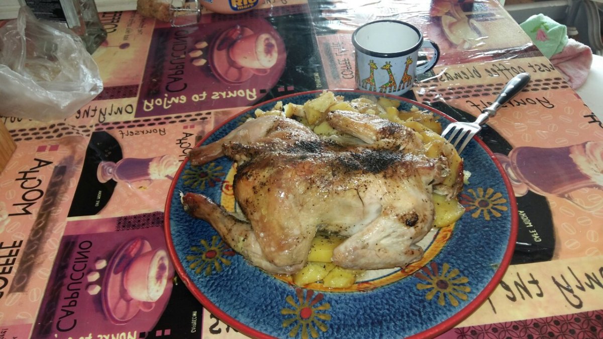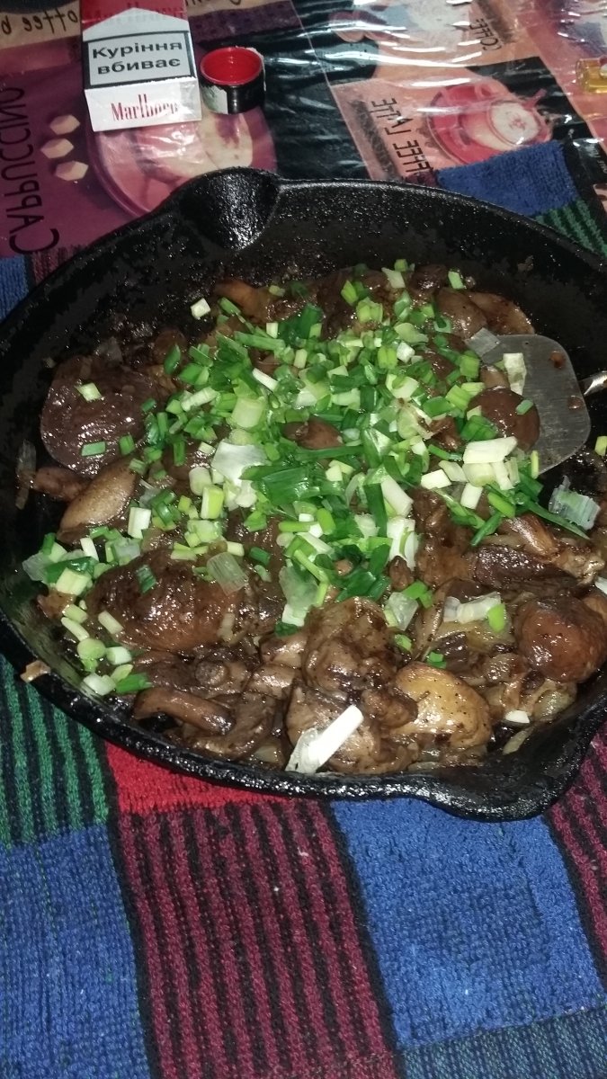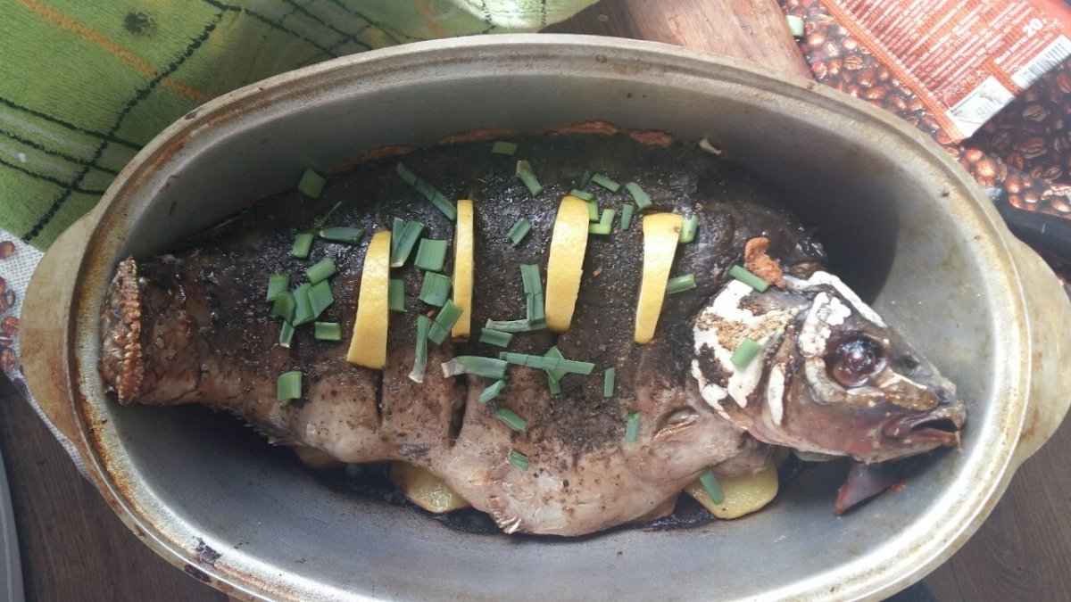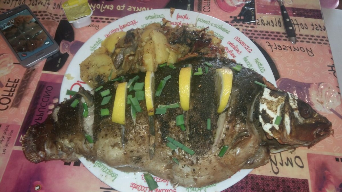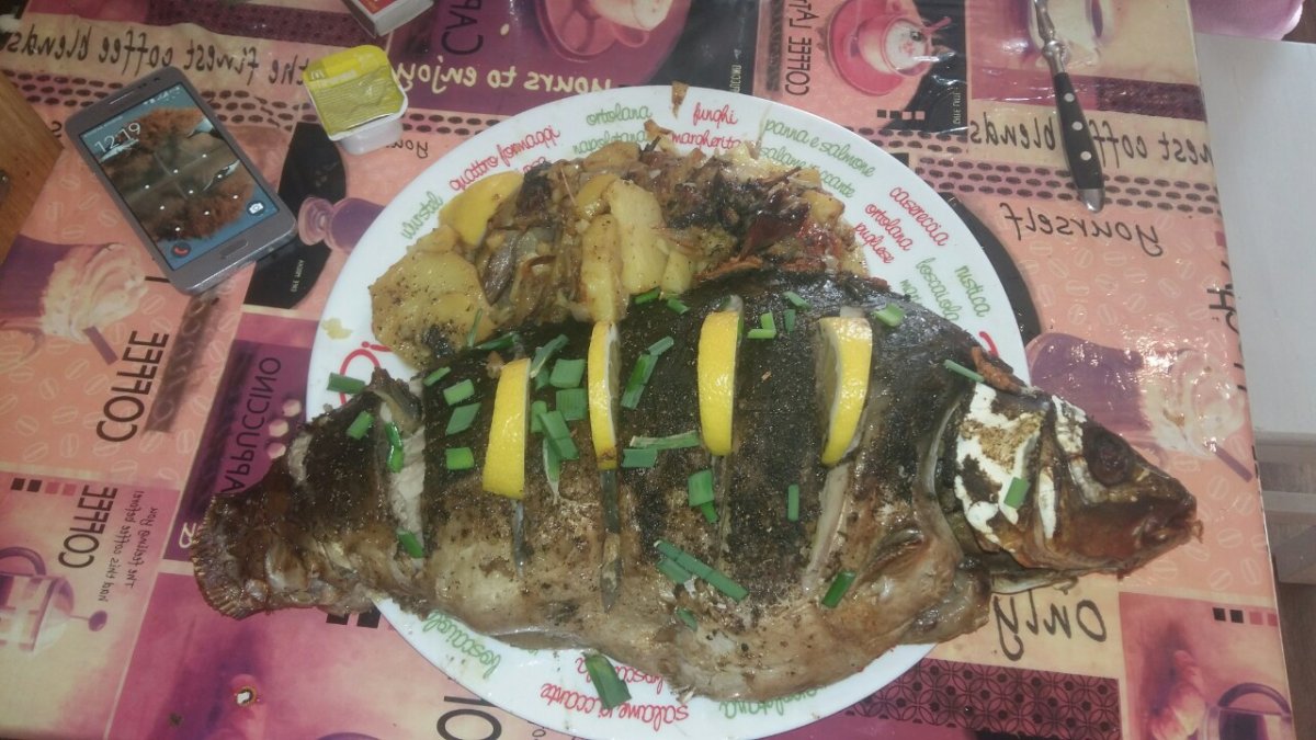 пришёл с рыбалки , изловил карпа на 2.6 кг, только распотрошил думал замариновать а затем закоптить , как неожиданно пришли гости причем в количестве, дома была курка домашняя , и замороженные с осени маслята пришлось все это готовить по быстрому , но все остались сыты.