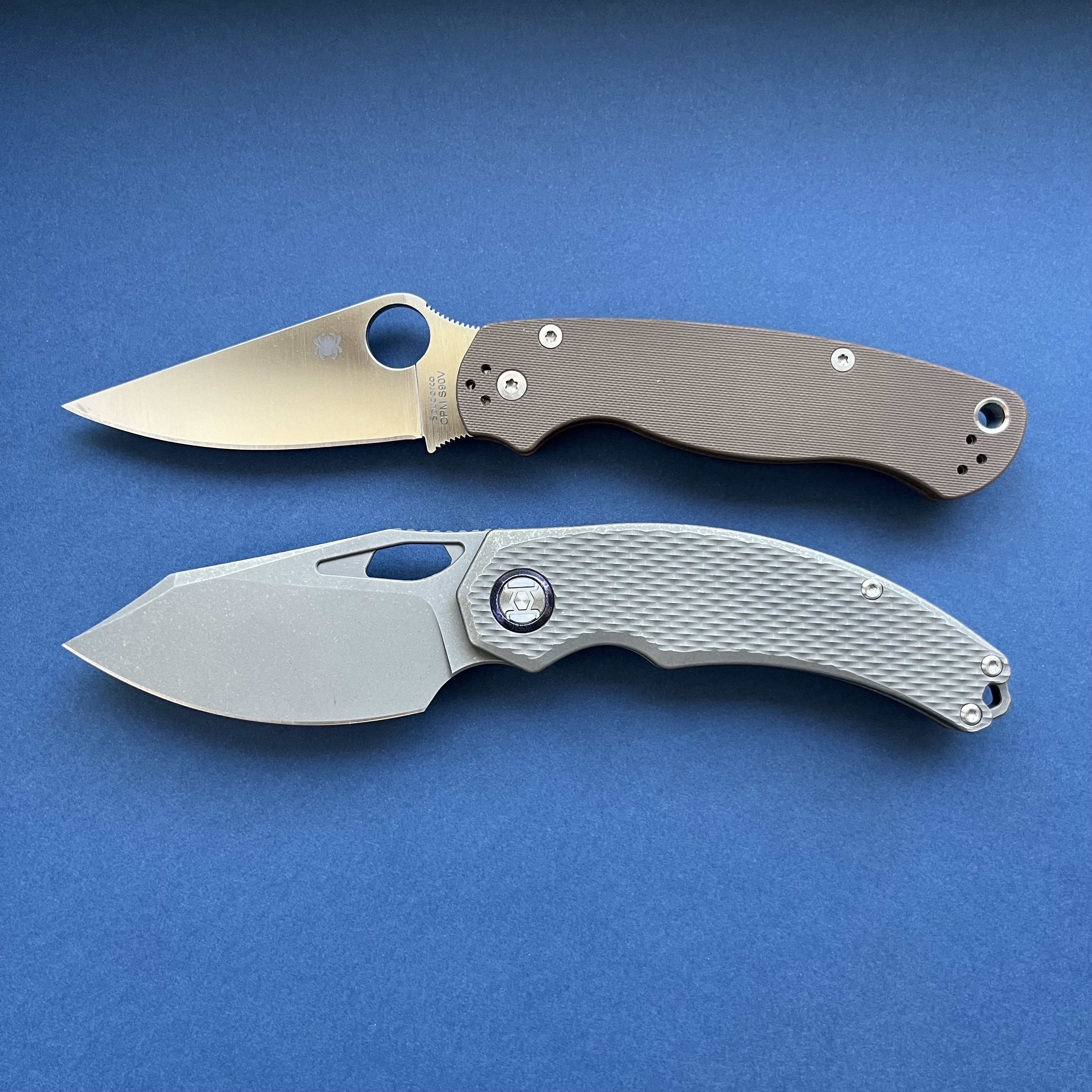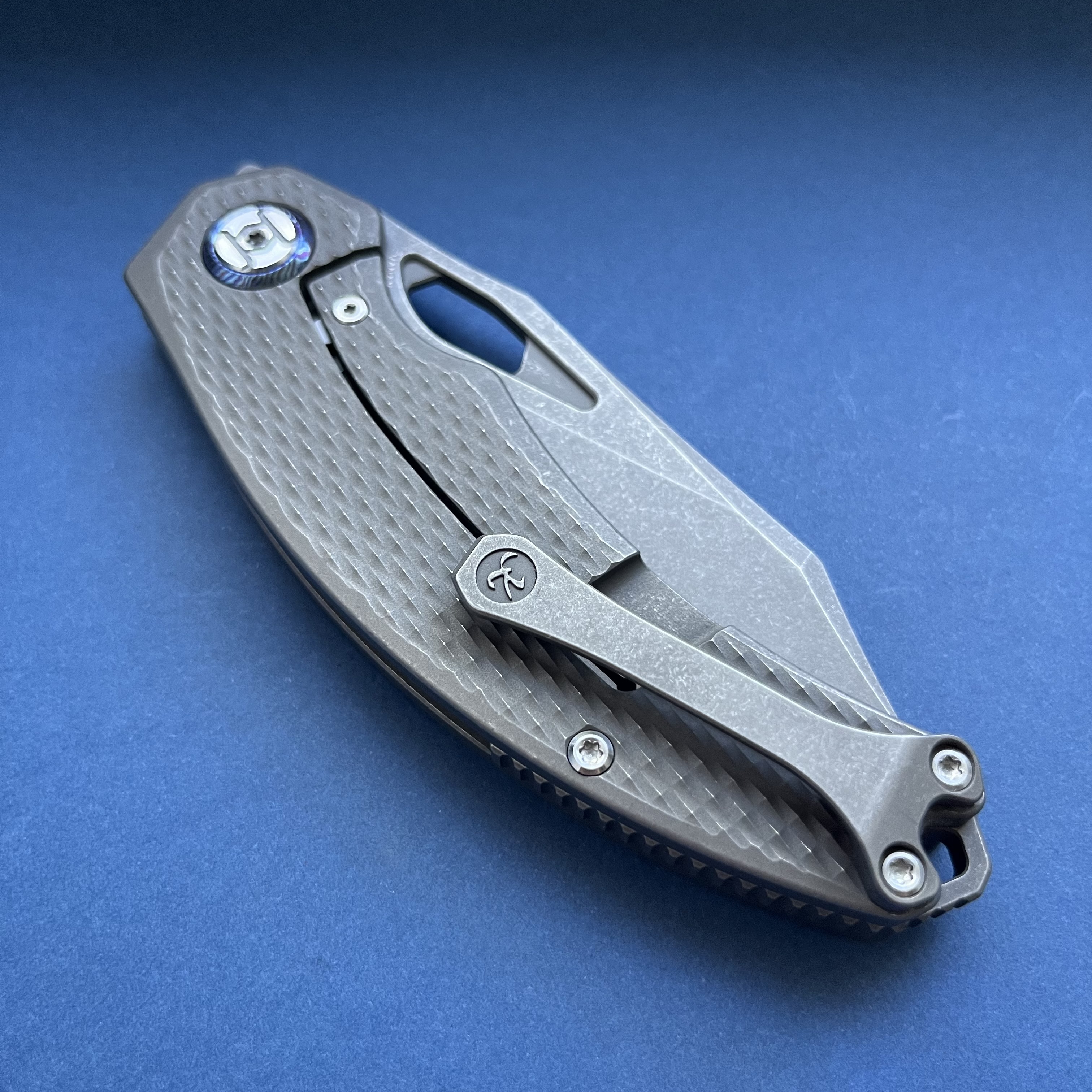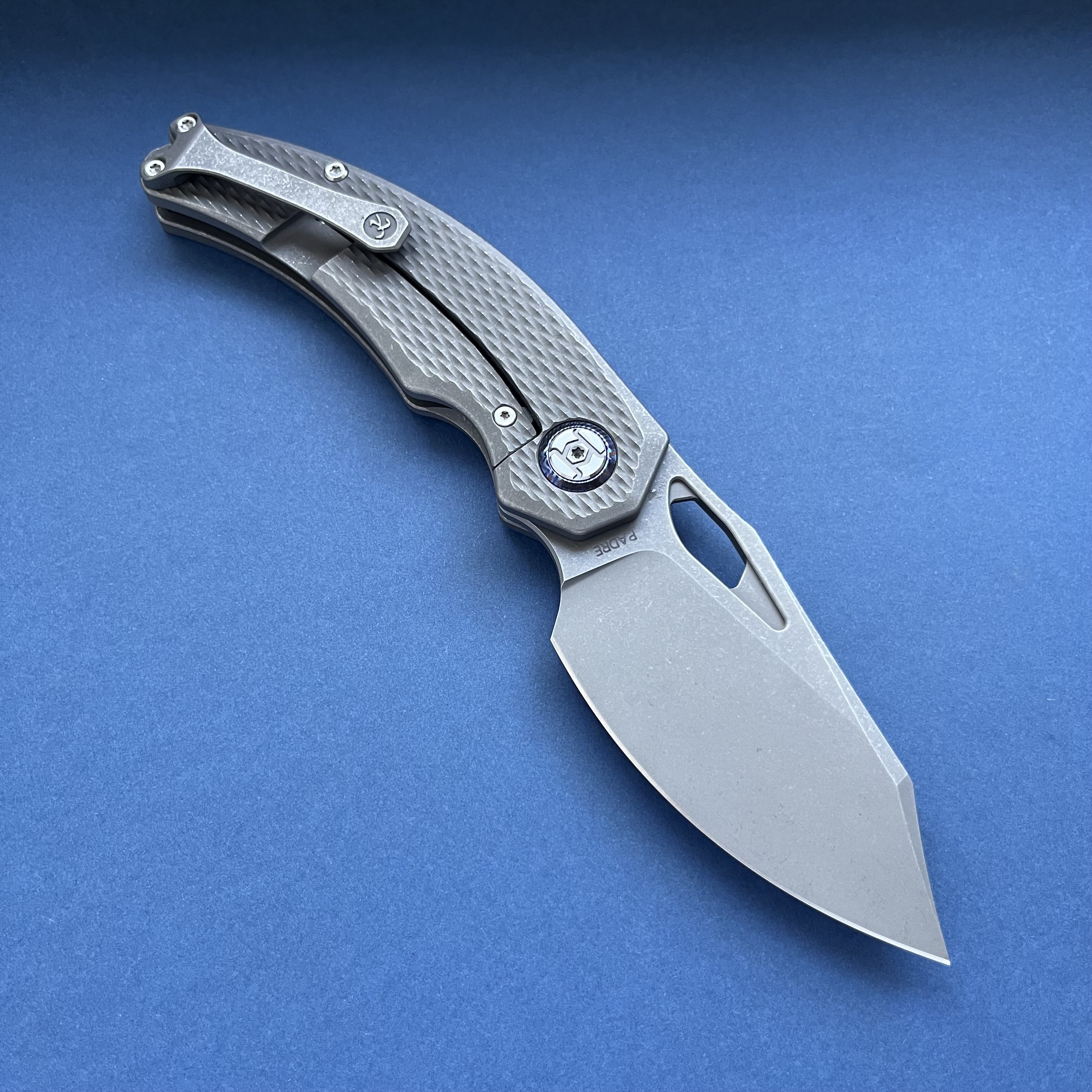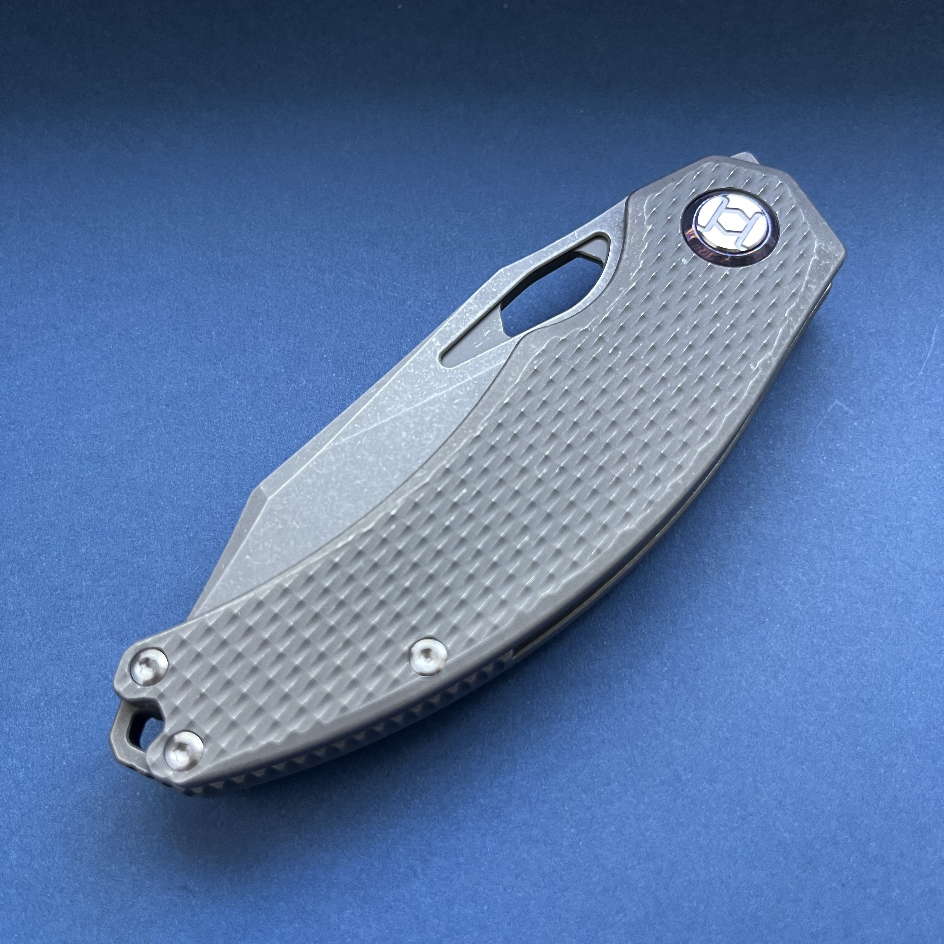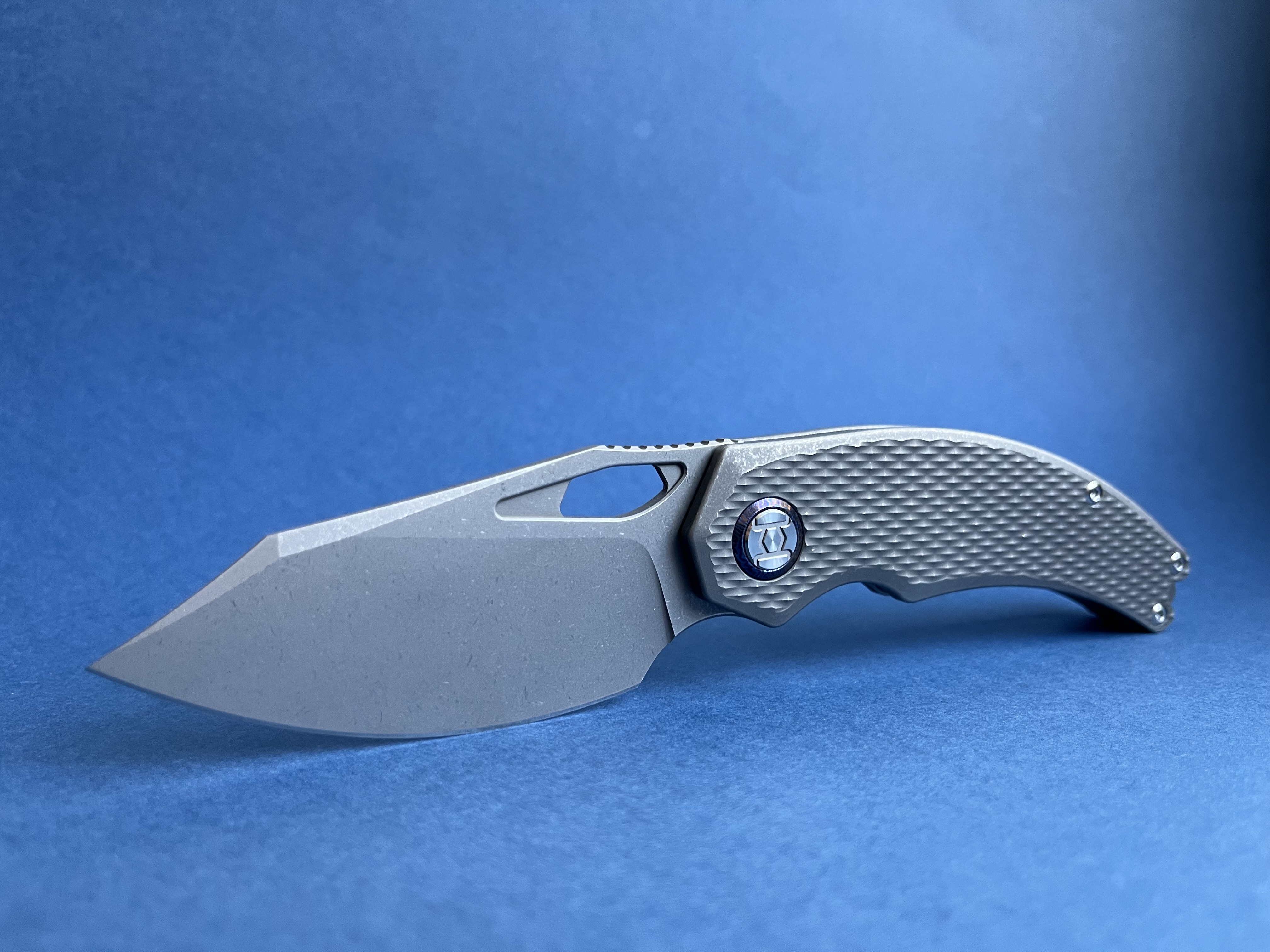 Вітаю спільноту Kunwu Padre Бренд з Піднебесної, який пропонує цікаві дизайни в преміум матеріалах за помірну ціну. Титанові накладки в стоунвоші мають Diamond патерн та забезпечують надійне утримання. Клинок виготовлено з супер-порошкового VANAX (60-62HRC) який буде залишатися гострим дуже довго. Цільнофрезована титанова кліпса та декоративні шайби на вісьовому вузлі з Mokuti. Ніж зручно утримувати звичним хватом так і за чойл - Загальна довжина: 204 мм - Довжина клинка: 85 мм - Товщина в обусі: 3.7 мм - Сталь: VANAX - Матеріал руків'я: Titanium - Вага: 144 гр. Єдиний нюанс - коробка має проріз з митниці Ціна 299$ за новий ніж Також у продажу: Spyderco Manix2 CTS-204P sprint run