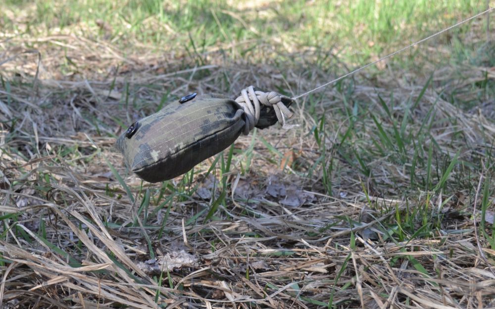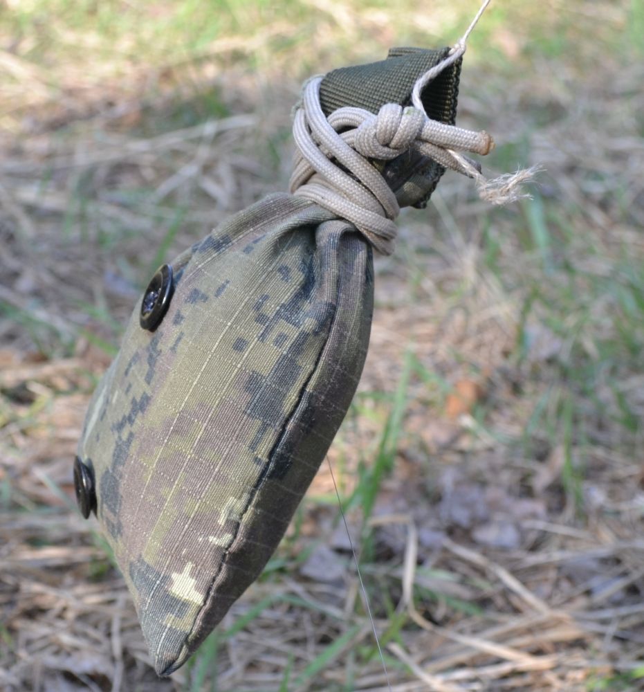 На фото імпровізований клюд до підривача МВЧ-62 з гвіздка. Імпровізована кішка для натяжних датчиків зі звичайного мішечка з нашити на нього гудзиками , які ми іноді використовуємо.