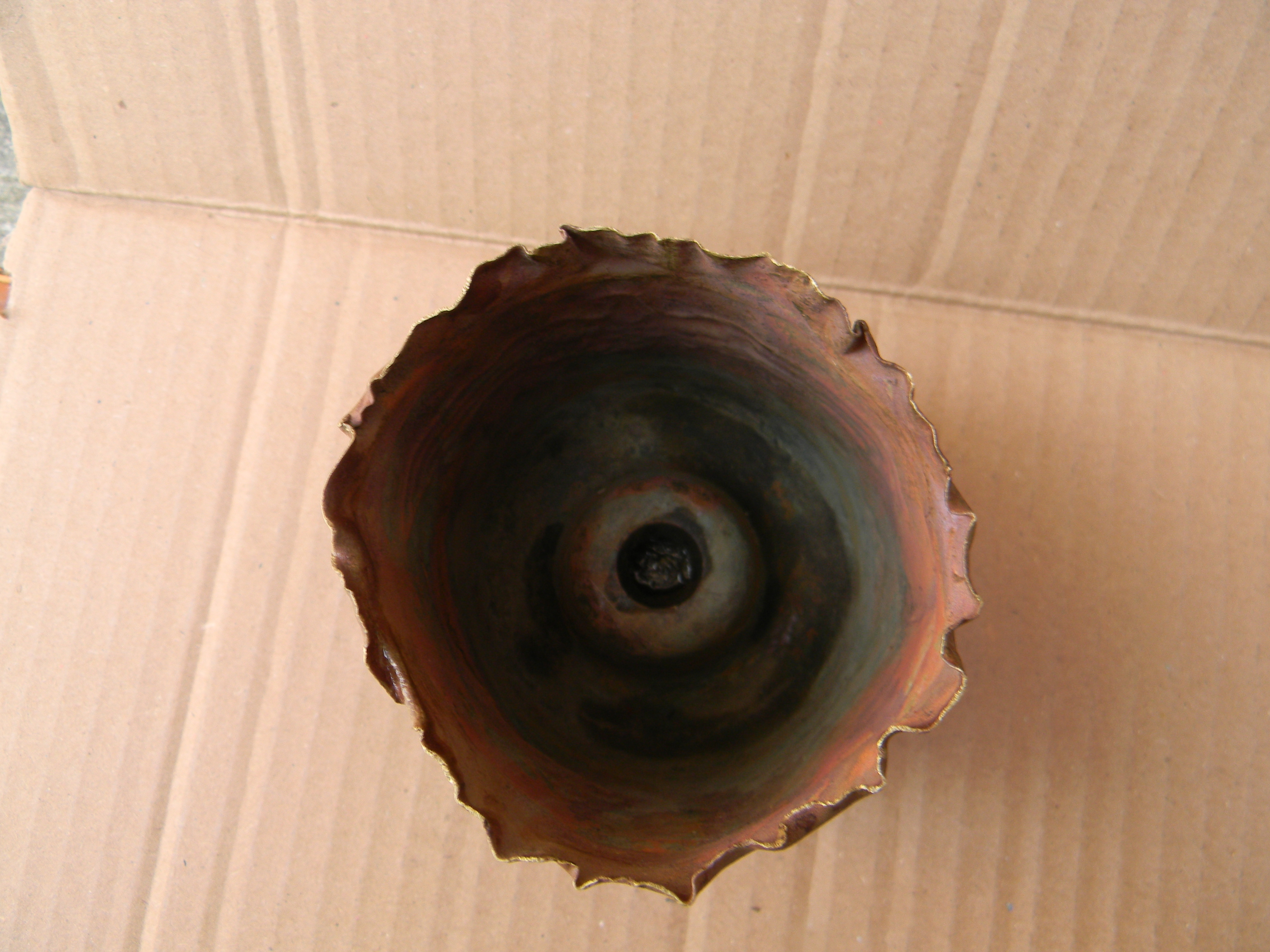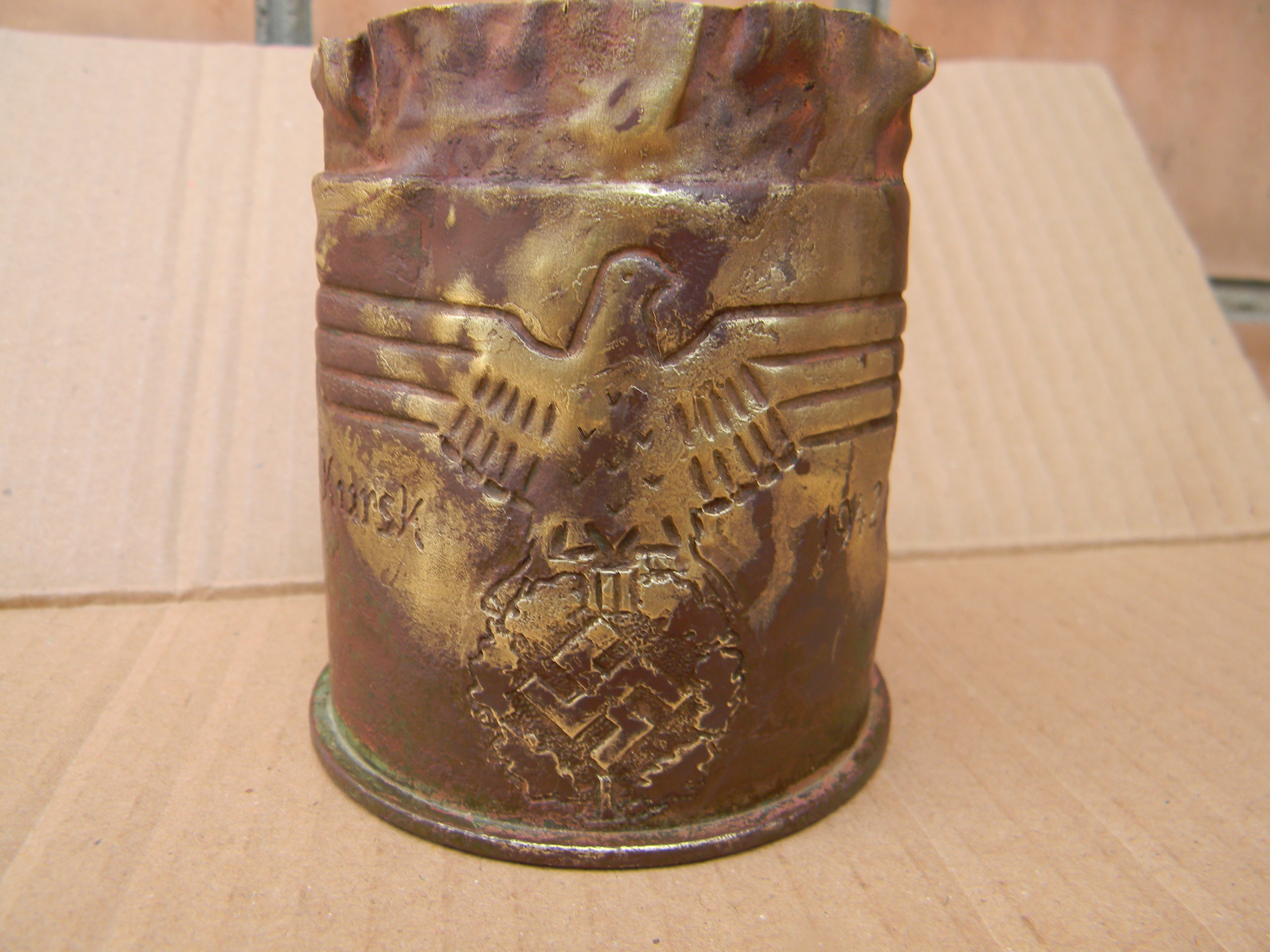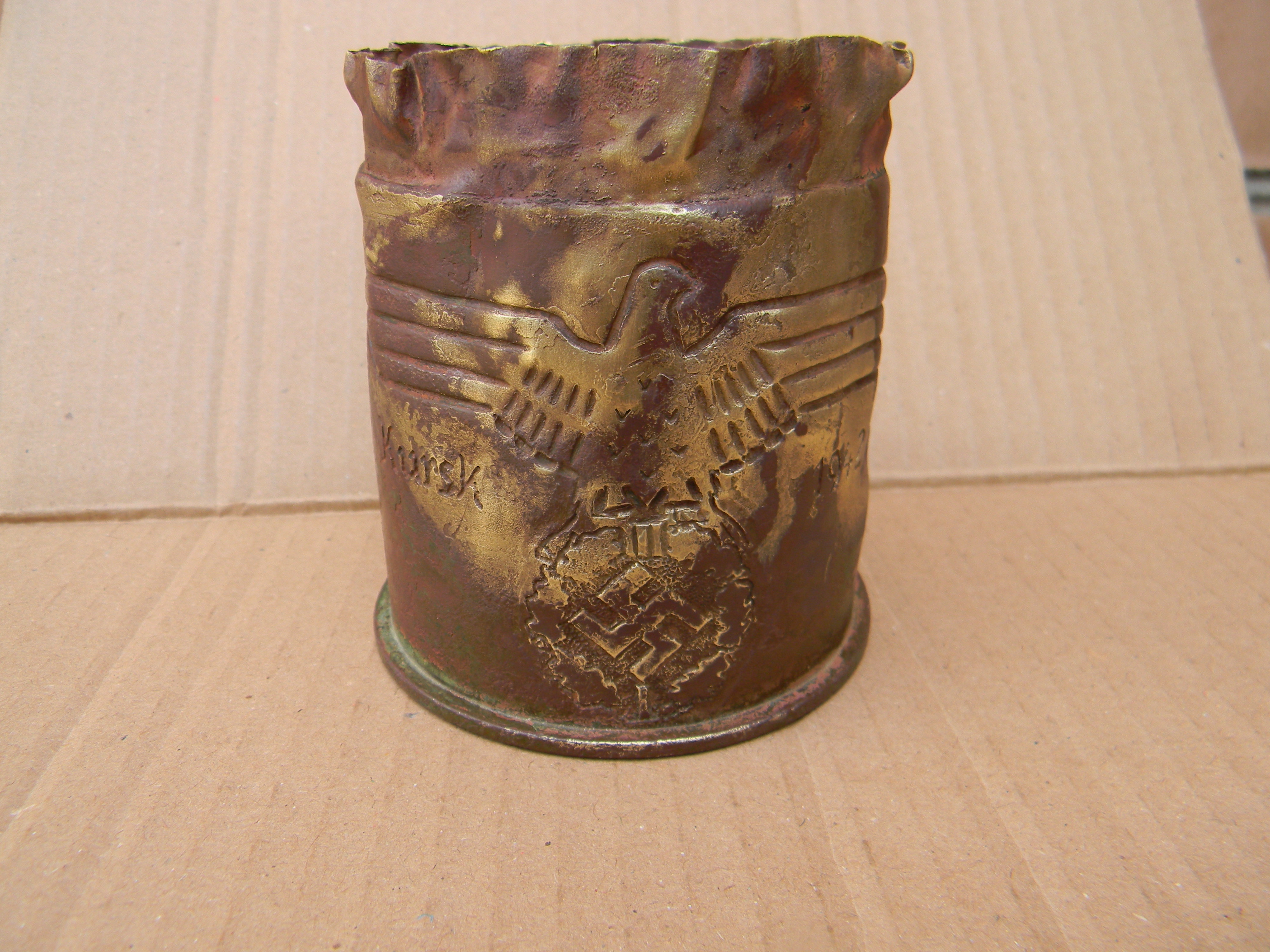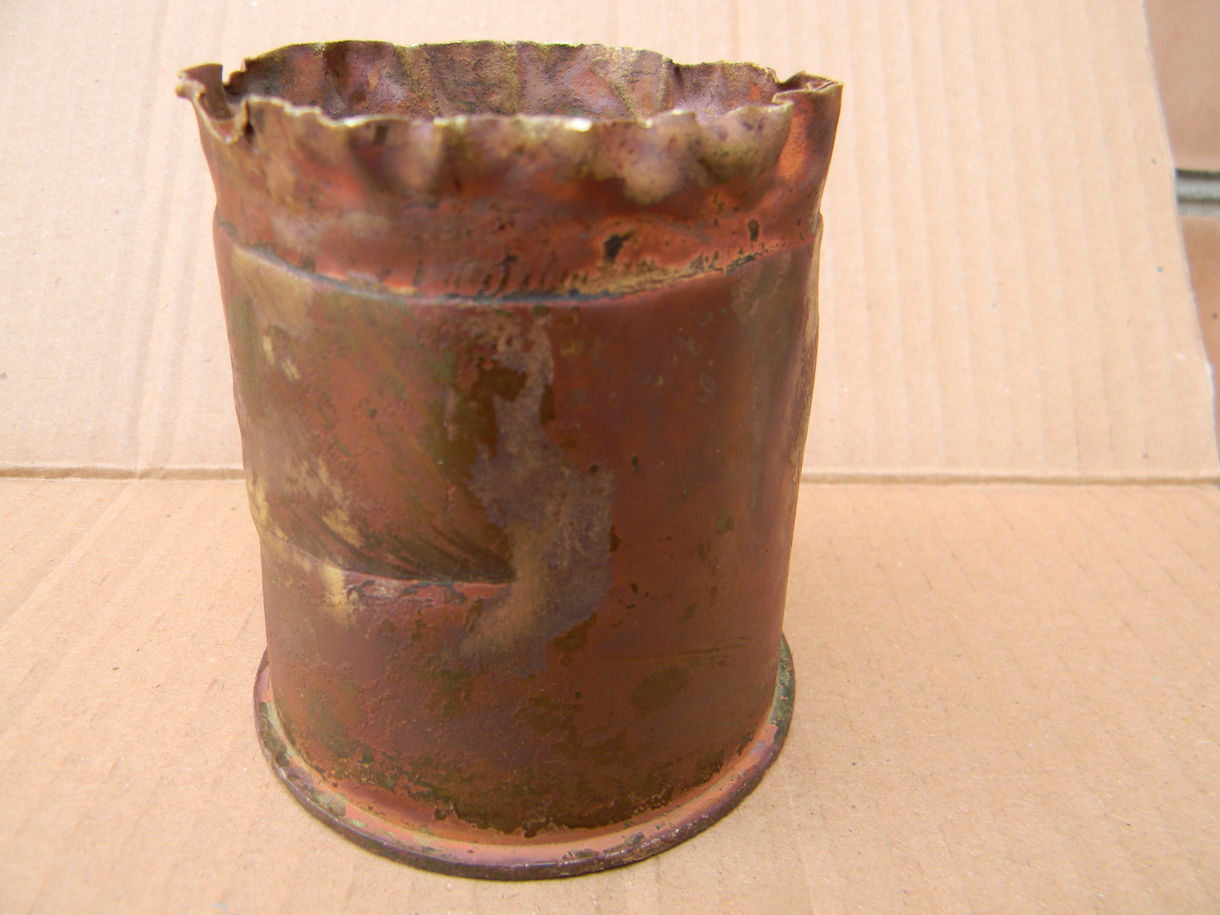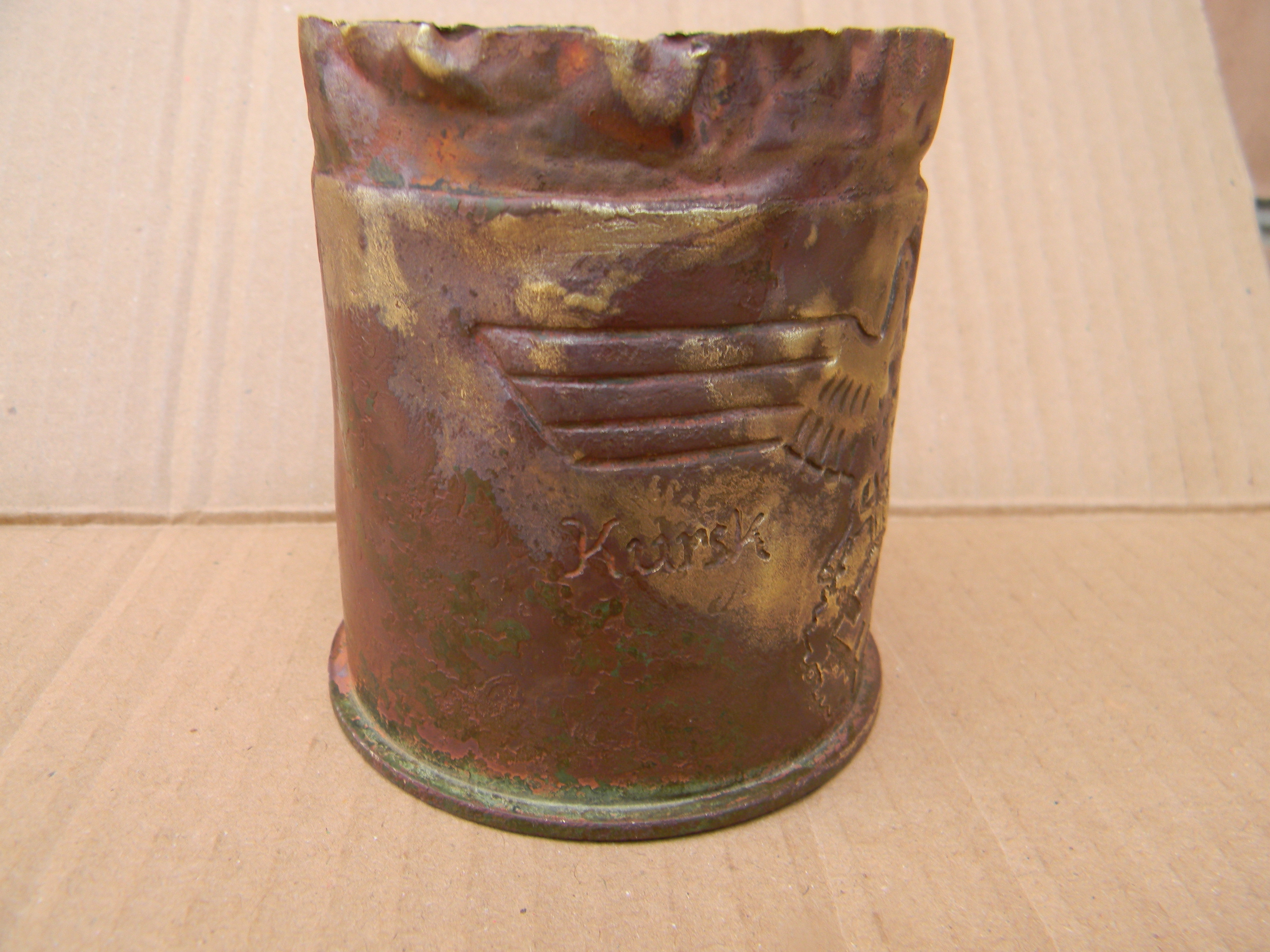 Вітаю. Гільза до легкої піхотної пушки 75мм. Колись продавав по 100грн, а зараз не знаю. Курка була на донці, а тут збоку, та ще і така велика. Це що сувенір, чи так повинно бути? Не знаю. У мене така зараз стоїть біля компютера, як сувенір для ручок і карандашів. З Вашої був би кращий сувенір, тільки почистити і рихтонуть її.