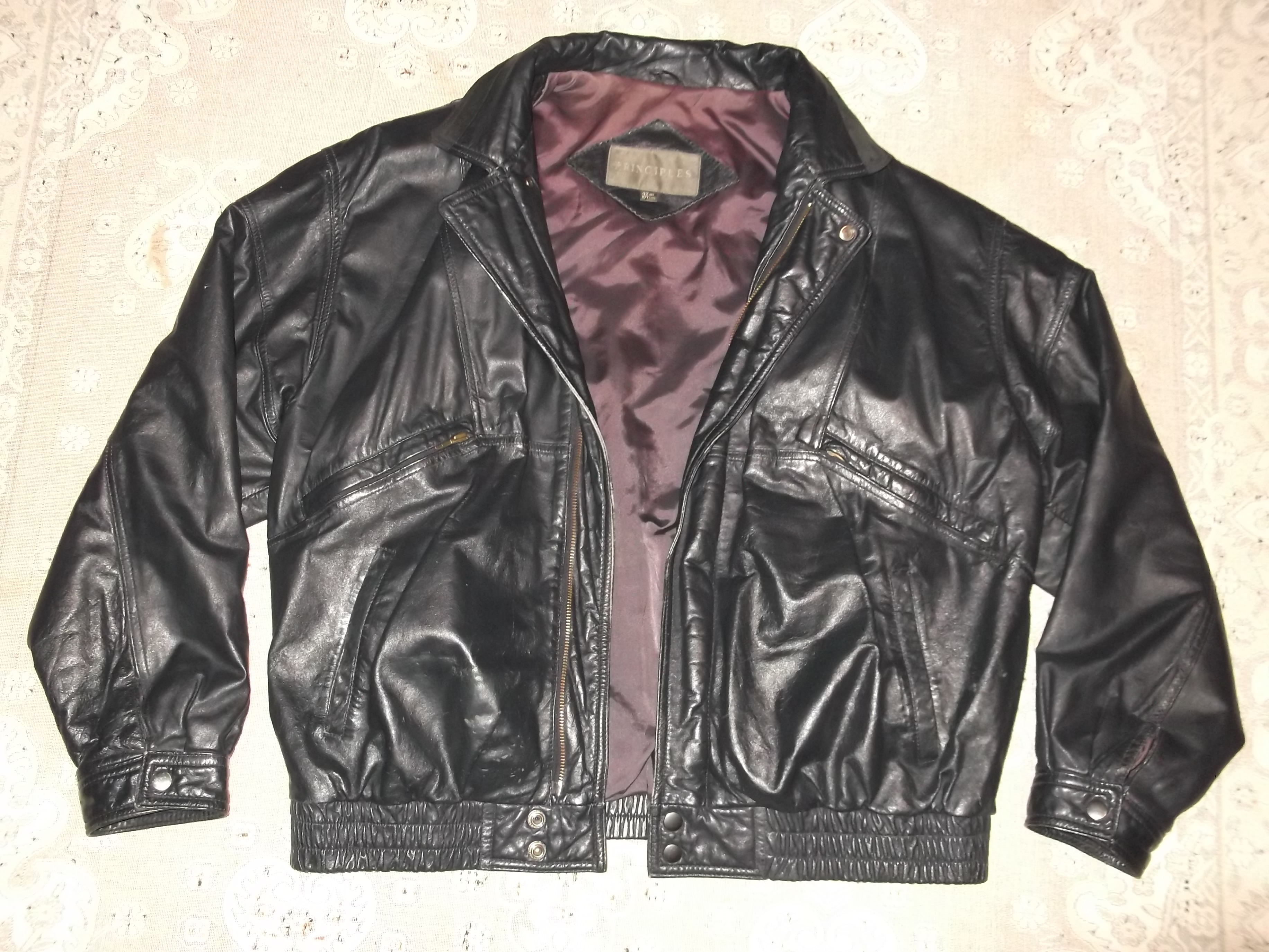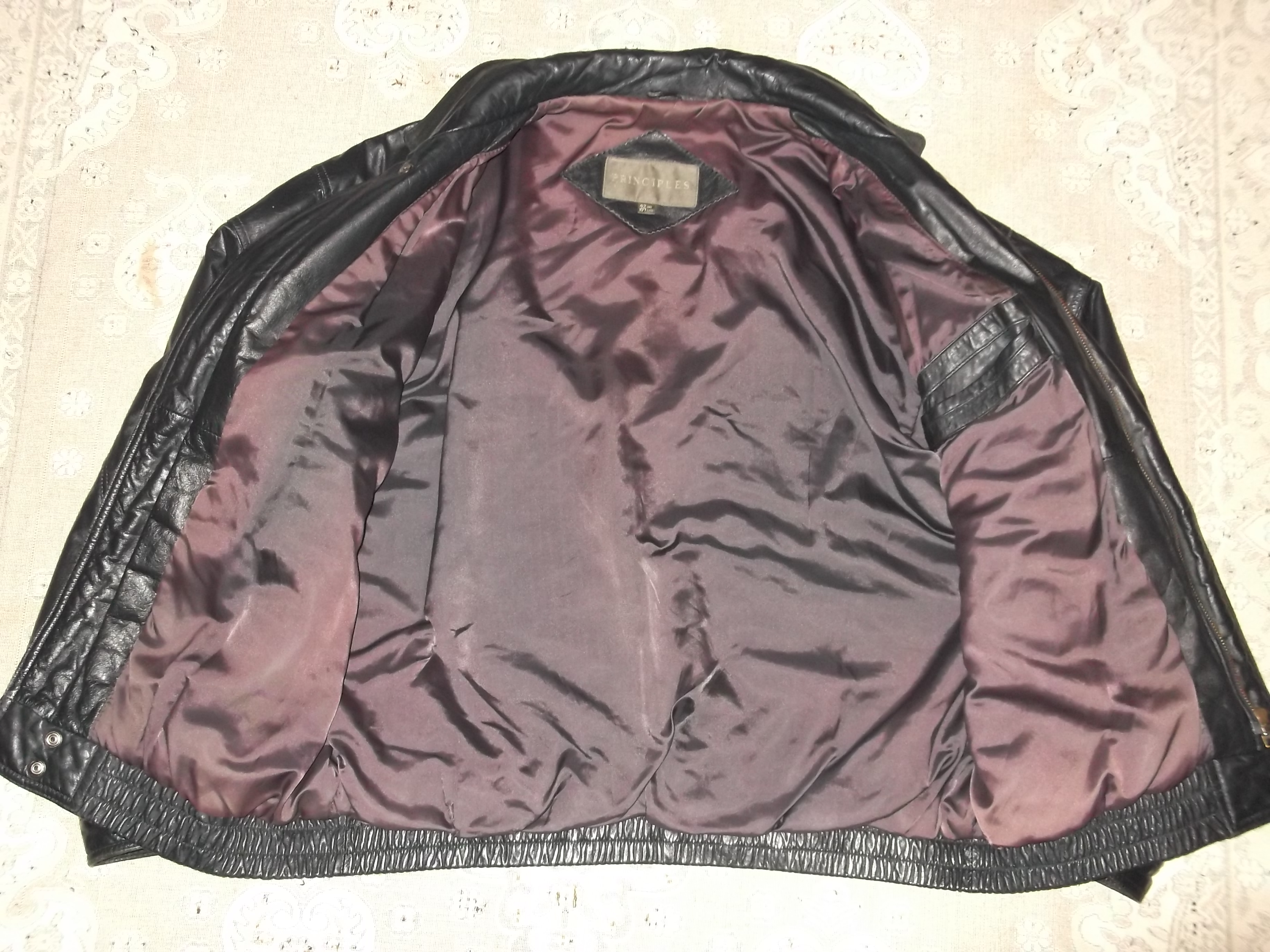 Шкіряна куртка британського бренду Principles by Debenhams 100% натуральна шкіра, колір dark eggplant color підкладка 50% нейлон/50% ацетат кишені 4 зовнішні та 1 внутрішня виробник Південна Корея Розмір 42" (107см), орієнтовно L на середній зріст: - ширина по плечах 56 см, - ширина по грудях (між пахвами) 60 см, - довжина рукавів 60 см, від коміра 80 см, - довжина по спині від коміра 66 см. Стан б/у, все як на фото. Ціна 360 грн. ПБ, mono / НП, Укрпошта