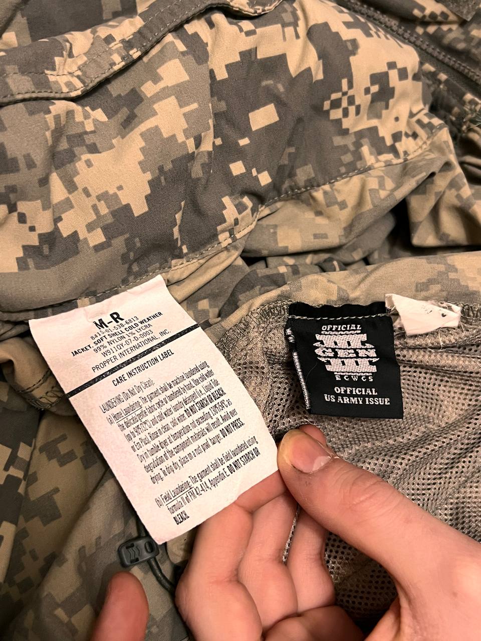 Оригінальна контрактна куртка американської армії ECWCS level 5 (софтшелл) покрою ACU в патерні UCP. CWCS Gen III Level 5 — легкий ізолюючий шар зі складу системи Extreme Cold Weather Clothing System (ECWCS) Gen III для захисту від негативних факторів навколишнього середовища, може використовуватися в якості основного ізолюючого шару цілий рік та при значно гірших погодних умовах і нижчих температурах. Level 5 можна вдягати як самостійний шар для захисту від опадів низької та середньої інтенсивності у літню спеку, так і в якості захисту від механічних ушкоджень та вітру поверх утеплювальних шарів при від’ємних показниках температури. Такій універсальності також допомагають наступні конструктивні особливості. Ізолюючий шар для захисту від негативного впливу вітру, пилу\піску та опадів. Легкість та компактність. Еластичність та паропроникність. Регульований капюшон, що складається в комір. Вісім кишень. Основний матеріал: нейлон Milliken Nylon з вологовідштовхувальною обробкою. Куртка виготовлена з інкапсульованих силіконовим полімером зносостійкої тканини MILLIKEN nylon з використанням унікальної технології EPIC, завдяки чому, виріб добре дихає маючи водовідштовхувальні й вітрозахисні властивості. ECWCS Level 5 дуже гнучкий по своєму застосуванню. У комбінації з утеплюючими шарами куртка є відмінним зовнішнім шаром для холодної або вологої погоди і, в той же час, її можна використовувати в будь-який час року. Виріб має малу вагу і невеликий обсяг. Стан: нова, без упаковки, без нюансів. Розмір: M|R Заміри курткb Довжина 81 см. Ширина в самому низу 59 см. Від рукава до шва 62 див. Від пахви до пахви ширина 62 см Плечі 55 см Виміри зроблено в спокійному стані речі, так що ще значно потягнеться. Ціна: 4099 грн