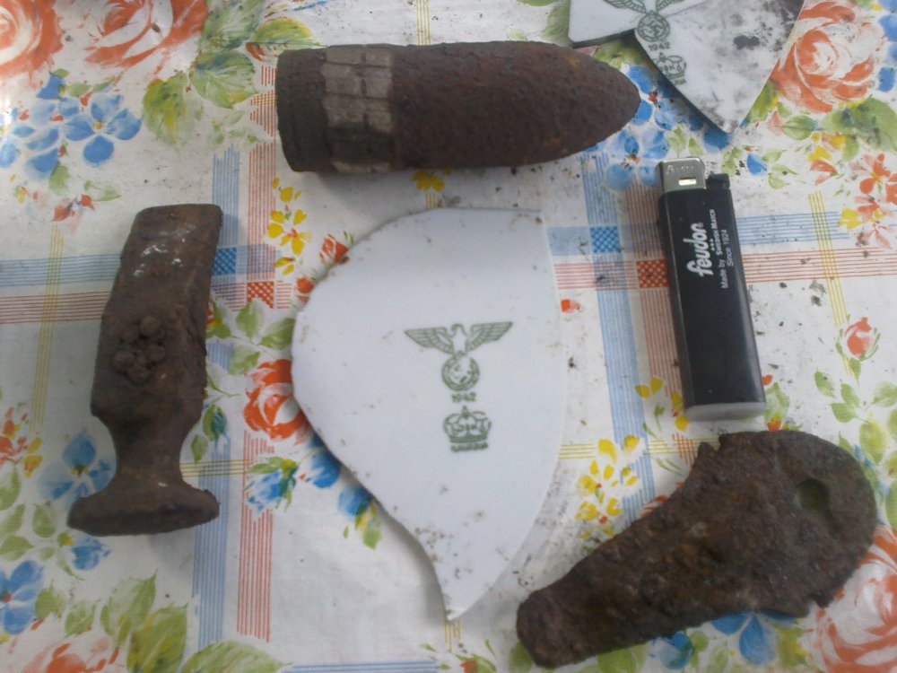 С Левой стороны сапожный молоток 1985 года.В Верху сгнившый бронебой.Дальше.Зажигалка современная.Ниже кусом гавна ржавого.А по центру кусок разбитой тарелки с курицей.НУ вчем вопрос.Цена на перед 0000 Все.