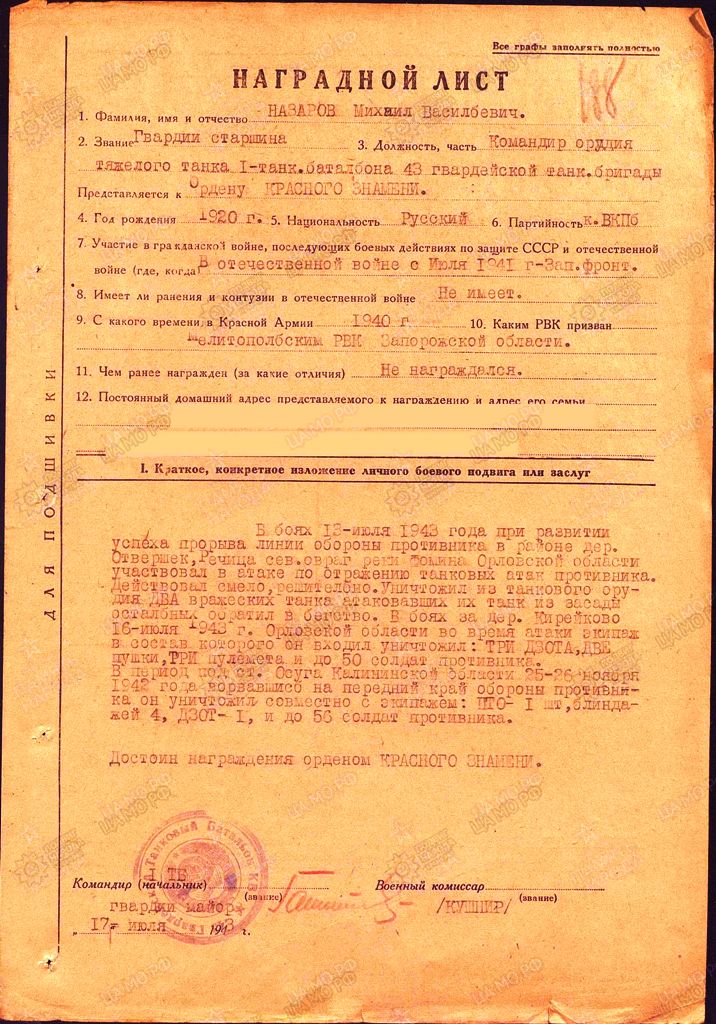 Далее начинается история танка КВ-2 в составе 145-й танковой бригады, но в неё углубятся пока не будем. Напомню лишь, что в составе 145-й (с 10 апреля 1943 года - 43-я гвардейской) ТБР в июле 1943 года успешно действовал один танк КВ-2. Упоминание о нем в ЖБД бригады на сайте Память народа в 2015 году нашел ув. [​IMG]panzeralex (ссылка). Командиром орудия этого танка продолжал оставаться гвардии старшина Назаров Михаил Васильевич.
