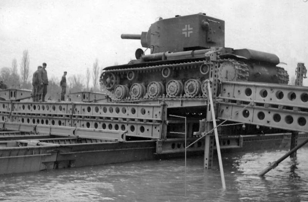 2-3) Russische Beutepanzer KV-2 mit Balkenkreuz im Einsatz als Übungspanzer des Pi.Lehr.Btl.2 an der Elbe in Dessau-Rosslau, Sachsen-Anhalt, 1942.
