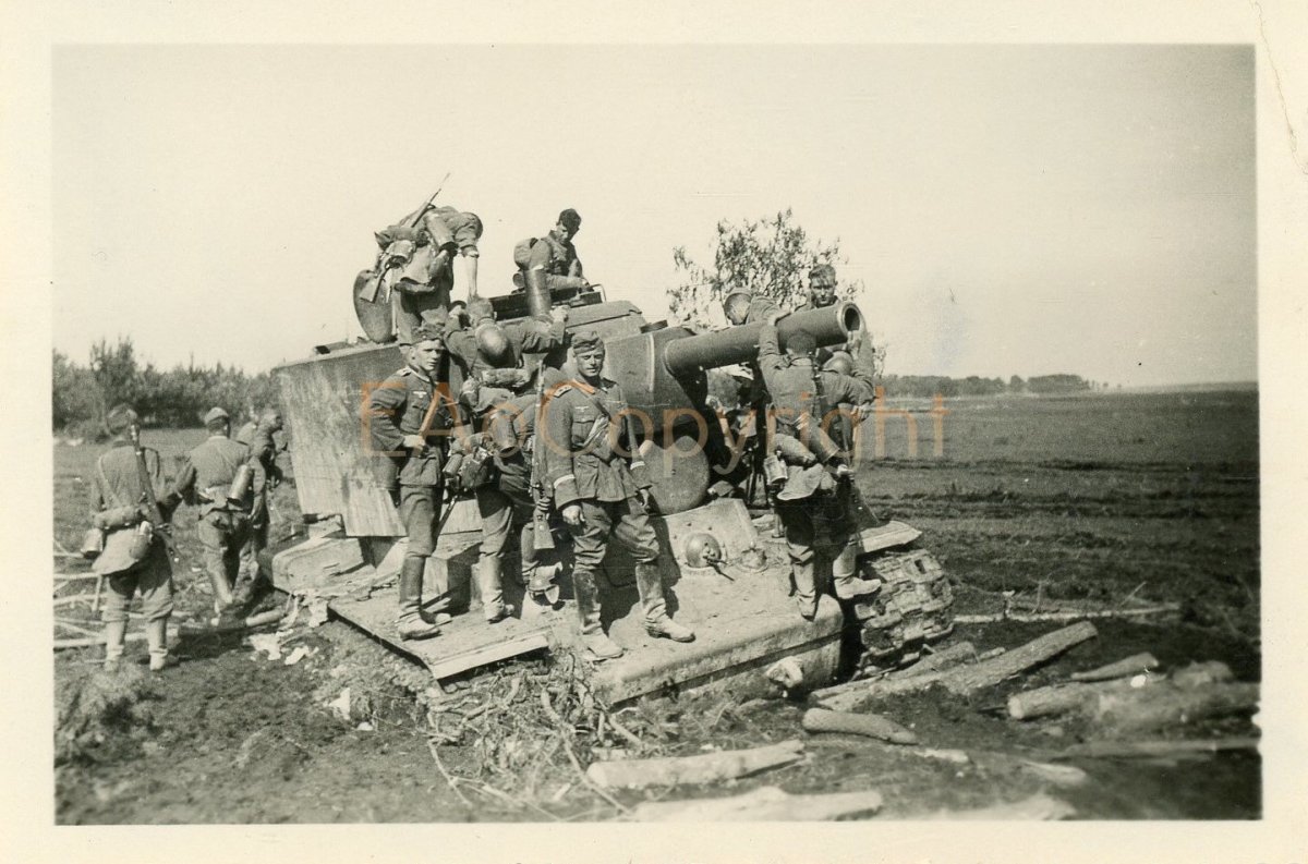 1) Soldaten des 13./Inf.Rgt.410 mit russischer Panzer KW-2 bei Leningrad, Russland.