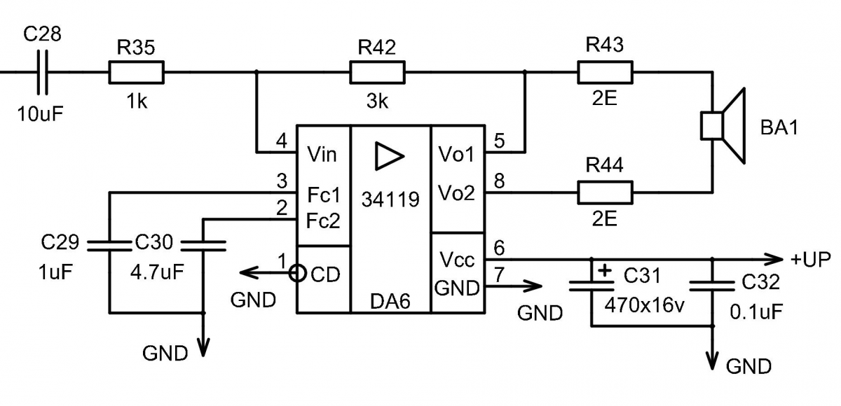 Ну что начнем! Раз вы начали опять на птичем языке говорить,я постараюсь тоже на птичем языке только немного на другом. Птицы ведь тоже разные бывают. Для начала вот вам ссылка с даташитами на микросхему. https://datasheetspdf.com/datasheet/search.php?sWord=34119 От даташитов будем плясать. И так схема ваша ГАВНО! Там есть ошибки ,да и автор схемы рисовать не умеет. Какой в жопе 10 микрофарад,если на всех схемах 0,1 мкф стоит. Смотите схемы и даташиты. А нахрена тами 2 резистора рисовать? Если сильно хочется можно один нарисовать только с бОльшим сопротивлением А нахрена они там вообще нужны? что даташит пишет? Если питание девайса=3 в сопротивление нагрузки 16 ом мощность 55 мв Если питание девайса=6 в сопротивление нагрузки 32 ом мощность 250 мв Если питание девайса=12 в сопротивление нагрузки 100 ом мощность 400 мв Даже на китайские девайсы есть эти данные. по данной схеме не понятно какое питание заходит на схему но скорее в пределах3-5 вольт. Значит динамик должен быть в таком пределе. Нахрена городить огород и греть резисторы. Что в наше время динамики купить нельзя? Вывод: Схему наогородили из чего попало,не разобравшись. Слепили ,пищит ,и ладно. А нормальный даташит не смотрели. Такая схема должна использовать 2 питания,но один вход посадили на землю,ну слава Богу работает как попало и ладно! Посмотрие как Моторолеры организовали схему с одним питанием. ну вот как то так.