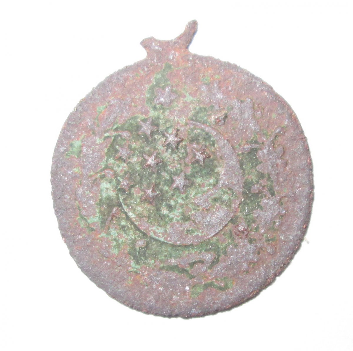 Исламский кулон,заменяющий крестик. Полумесяц и 9 звезд-девять пророков (Нух, Ибрахим, Давуд, Якуб, Юсуф, Айюб, Муса, Иса, Мухаммад) называются в Коране «стойкими» из-за их стойкости и непоколебимости при выполнении Божественного послания, противостоя всем трудностям и лишениям. На оборотной стороне изображение солнца-символ пророка Мухаммада. В исламе изображать лик пророка нельзя,поэтому его изображают в виде пламени либо солнца