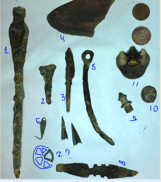 так-как ася моя накрылась прошелся по глинистому берегу после шторма.интерес имеют меченые шмурдячки 1 думал часть ножниц но нет. 2 часть нака? или часть вилки железной?.3 собственно нак,только чей,привык что скифские маленькие бронзовые.4 обломок от молотка? или мое воображение. 5 хз. 6 снасть рыбацкая,интересен век.7 находил на этом месте амулет колесо! может часть такого -же? 8 похоже на отвертку.чья к чему? 9 медная хз,если надо пересниму.10 медяшка с резьбой(да надо было снять резьбу крупным пл).11 не впервой попадается такая окаменелая кость! что за зверюга? что надо пересниму.Все проявившим интерес к теме спасибо!