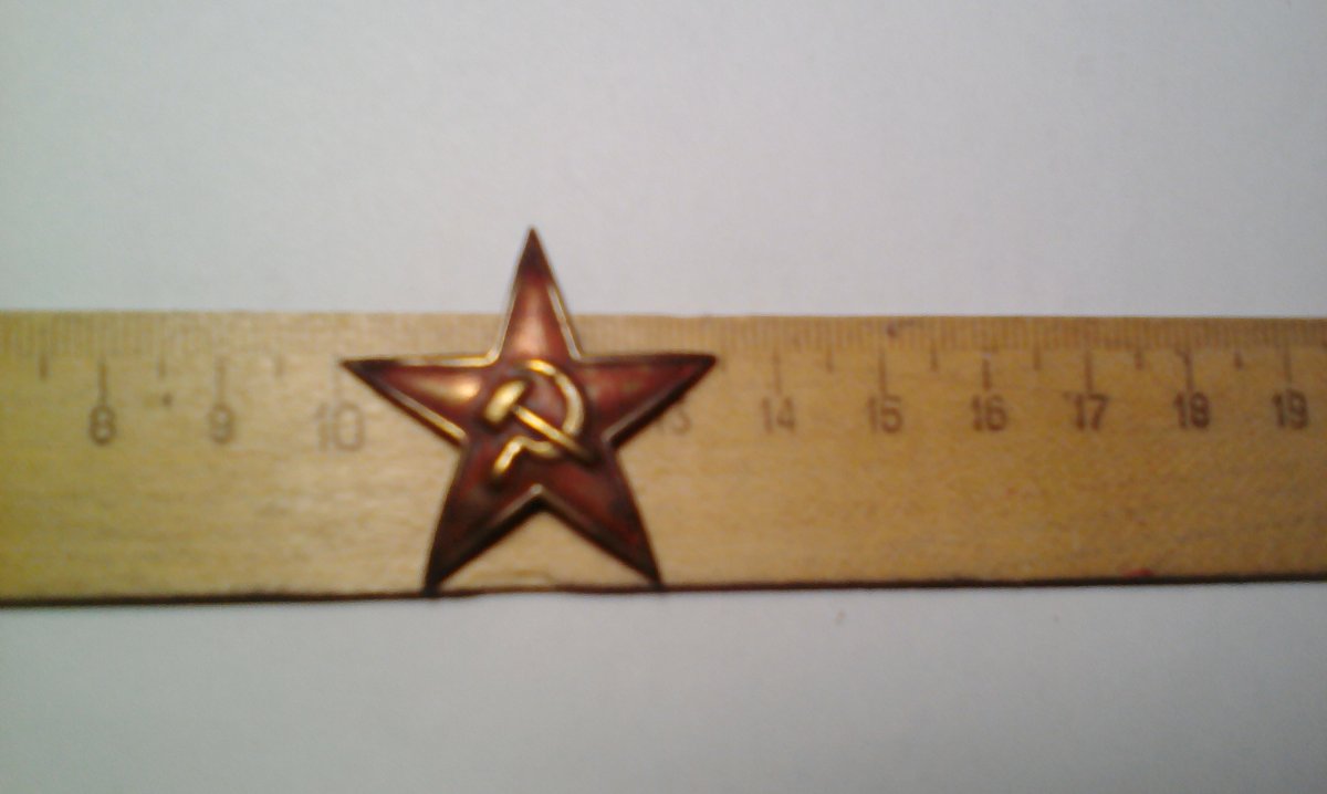 По этому типу звёздочек позднего периода конечно очень сложно узнать истину - их выпускали десятки (если не сотни) предприятий, цехов и артелей. Штампы имели незначительные отличия, разновидности видов эмалей и красок, их качество... . Попадалась мне в лагере из такой же серии (обр.1942 г), жестяная звёздочка (32 мм по лучам), но не крашенная, как большинство звёздочек из военного периода, а крытая эмалью. Хотя видно на глаз, что качество эмали военного времени было слабеньким: По звёздочкам более ранних выпусков определяться намного легче. По ним и литературы больше, и разновидностей чуть меньше. Вот звёздочка обр. 1922 г., размер 35 мм по лучам, вариант с "острыми" лучами, делалась без эмали (крашенная) Сохран хороший, потому что была найдена 40 лет назад. Я нашёл её, конечно, уже без краски, после чистки дорисовал сам красным карандашом: