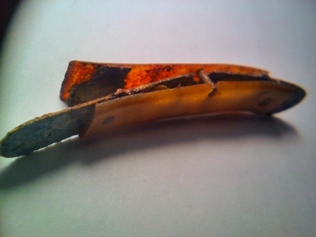 Христос Воскрес!! С праздником, господа форумчане! Не исключено, что конструкция этого колпачка была разработана за много лет до войны, и на хранении их оставалось много. А вот ещё одна находка лагеря, скорее всего из серии хэнд-мэйд. Очень похоже, что это была самодельная "опасная" бритва, сделанная из переточенного под небольшой "карманный" размер обломка фабричного лезвия (которое проржавело и разложилось в труху, буквально высыпалось при реставрации). Рукоятка сделана из двух разных по цвету и материалу полосок пластика. Длина рукоятки - 8,5 см. Внутренняя, сохранившаяся полоска металла, к которой крепилось лезвие и пластиковые накладки, сделана из цинковой полоски, скорее всего вырезана из цинкового патронного ящика. Очевидно, что умелец заведомо выбирал для этого более мягкий металл, чем лезвие, чтобы не тупилось остриё при складывании бритвы и контакта лезвия с рукояткой.