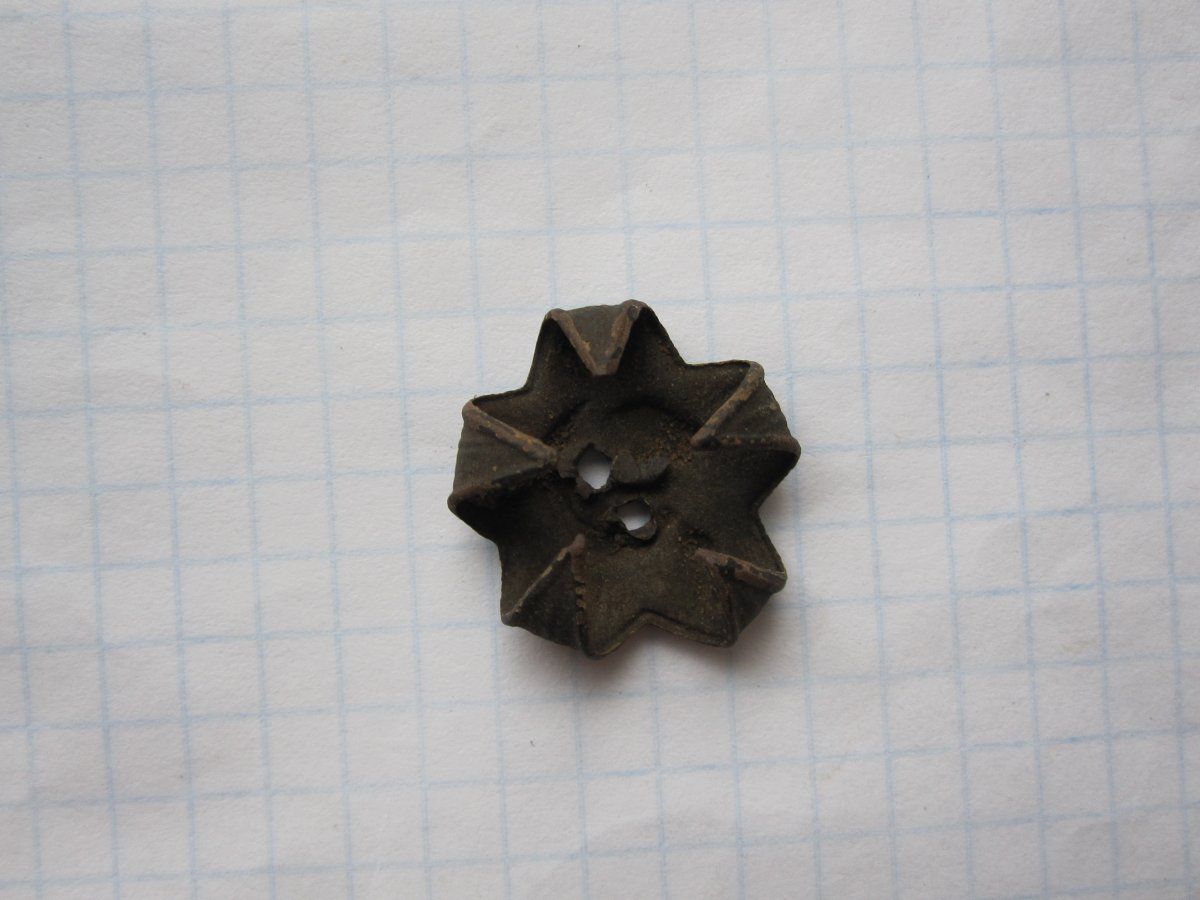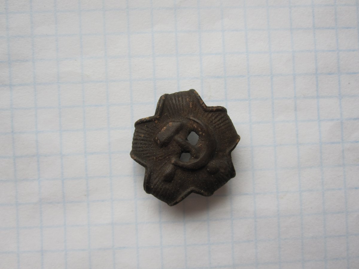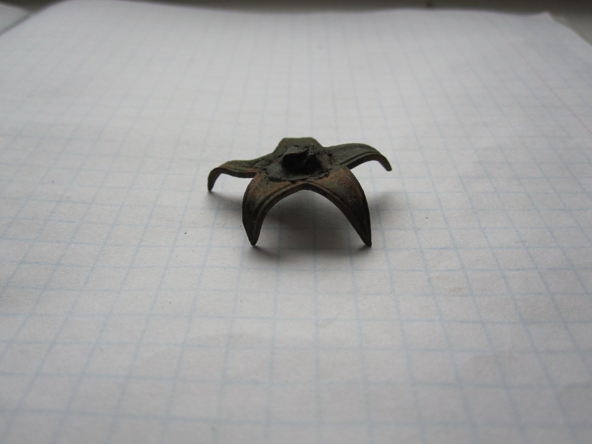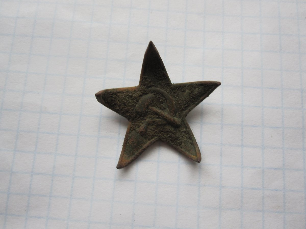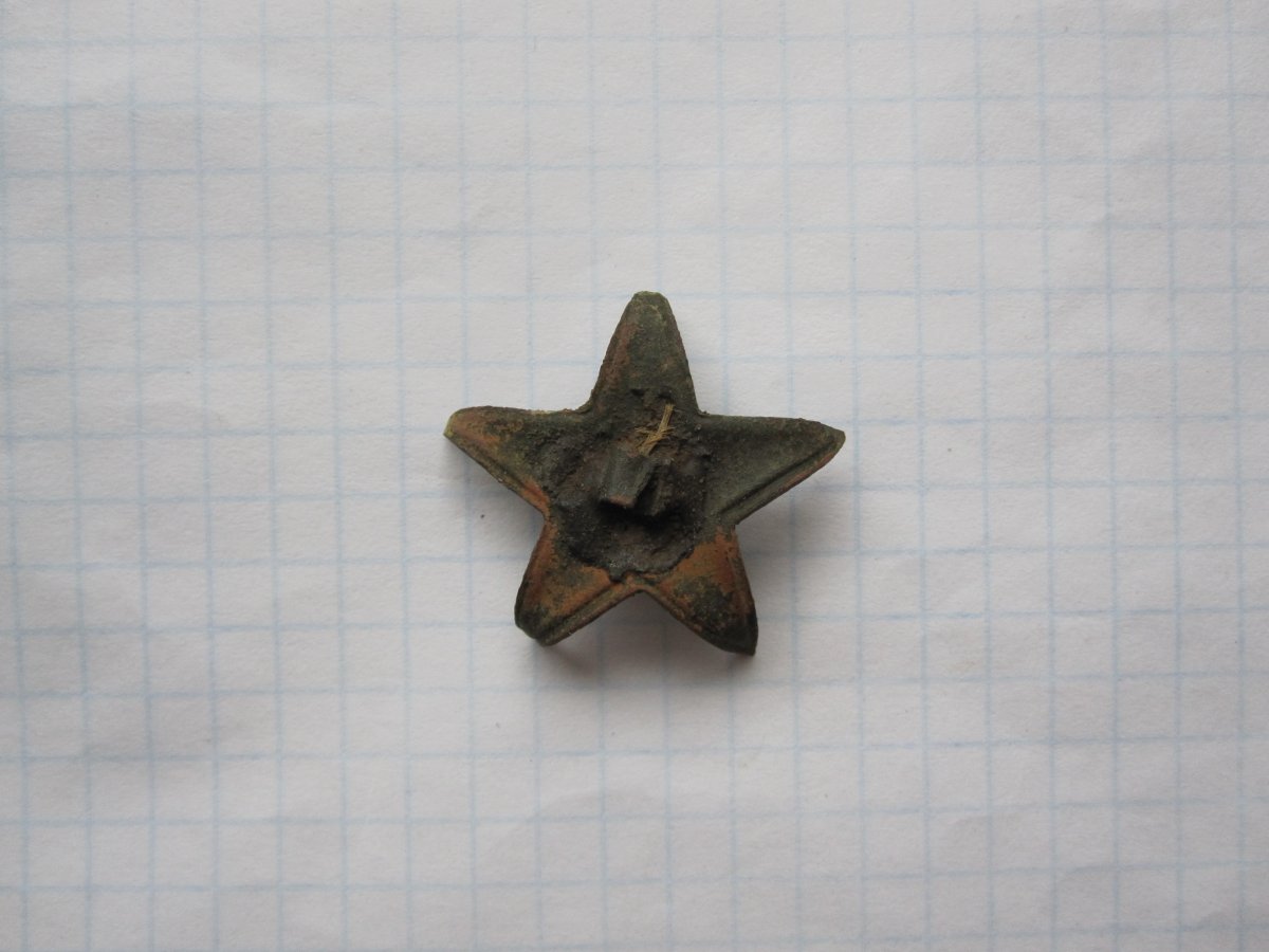 спасибо за ваше мнение. однако не соглашусь- скорее всего это не пуговица. 1) Не практично. Это обычная звезда ,видимо 30-х годов ,выполненная штампом на тонкой латуни. При не большом усилии сплющится или согнется.Проще перешить на мене заметное место гражданскую пуговицу или трофейную (если это было это уже во время войны) 2)Не остается вида "форменности". Звезда не различима. СиМ будет прикрыт ниткой.Проще изготовить например из латуни какой нибудь гильзы.Так как материал и инструмент там был - всяких поделок полно. Думаю все было проще. Даже в самые зажиточные времена лагеря, что бы получить новый знак различия взамен утерянного ,необходимо было какое то время. По этому ,да бы выглядеть по форме, использовались самопальные знаки различия. Например : звезда на головной убор выполненная видимо из латуни гильзы с отверстиями под пришив или вот треугольник в угол петлицы выточенный из пятикопеечной монеты 20х-30х годов 3) Согнутые лучи - шутки природы. Повторюсь : попадалось несколько звезд с выгнутыми лучами, кроме того попадались звезды с двумя-тремя выгнутыми подобным образом лучами. Как пример вот фото подобного" краба" . Обратите внимание" краб" выгнут СиМом во внутрь. Бойцу не зачем было прятать СиМ внутри ,при изготовлении пуговицы, оставляя на виду обломки кламмеров. Я думаю что такие " крабы" изготавливает природа. Вывод : все элементарно и просто. Солдаты бегали,прыгали ,ползали целый день -потом им дали свободное время ,что бы привести себя в порядок и на отдых.Вот один боец и обнаружил что кламмера на звезде обломились ,- а завтра с утра построение и выходной .Что делать ? -Выйти на построение без звезды на головном уборе ? Это как минимум наряд вне очереди ,вместо вечерних танцев под духовой оркестр. - Вот боец сделал пару дырочек и пришил красной ниточкой звезду. И почти не заметно. А если и заметит кто нибудь из командиров - ну что же, солдат проявил находчивость ,что бы выглядеть по уставу. Максимум сделают замечание. Потом ниточка порвалась и он звезду потерял или сам снял ,когда получил новую. А природа за долгие годы в земле сделала из звезды" краба" Всем спасибо у кого хватило терпения дочитать до конца.Что то я какие то повести стал писать - старею