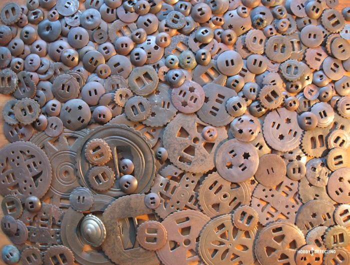 Добрый вечер! Тематика пуговиц с лагеря наверное никогда не иссякнет, как и неиссякаемо окопное творчество. Всегда будут неожиданные варианты и находки на эту тему. При необходимости солдат всегда придумает, как выйти из положения. Вот такие пуговицы-великаны попадались одному из наших уважаемых камрадов: (рядом для сравнения уставная большая шинельная пуговица) Эти две самоделки сделаны из тонкой латуни или рандоли (толшина где-то 0,3-0,4 мм), Сохранились выбитые пробойником кружочки металла из отверстий. Сложно сказать для чего такие большие пуги делались. Возможно для плащ-палатки или для откидного полога большой армейской палатки или тента....дальше у меня фантазия по применению этих гигантов не идёт. Самое интересное - на этих пуговицах были видны остатки зелёной краски. Наверное их красили для маскировки, чтобы латунь не блестела на солнце