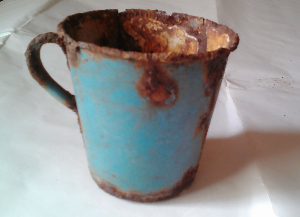 Конечно, вероятность этого не большая, но вполне может быть, что та лопатка, спрятанная Вами перед отъездом, тоже могла быть времён РИА - в Лагере находки предметов РИА встречались периодически, на первых порах в РККА ими активно пользовались. Сохран их конечно печален - неумолимое время!! Но атмосферу они передают. Мне, среди прочего, вот такая кружка РИА попададась (прошу извинить за повтор фото): Недавно я видел ещё одну такую же, но сохран ещё более плачевный, чем у моей, и к тому же, она была без ручки. Её кто-то копнул и не стал забирать - на неё без слёз не глянешь, дно - дыра. Так что, если суждено, Ваша лопатка долежит до следующего приезда. А если нет, то значит ничего особенного в ней не было. В Лагере такими вопросами рулит Лесной Дед - безоговорочный символ и тотем копарей. Он наводит на находку, он же от неё и отвернёт, если Вам она по настоящему не нужна. Проверено, и не раз! Я эту кружку тоже не сразу забирал - когда нашёл , подумал, что это хламец, к Лагерю не относящийся. Бросил под куст и забыл. А потом, уже зимой, листая форумы, узнал, что кружка эта времён РИА! И камрад знакомый, который в курсе этих вопросов, тоже подтвердил. Дождался я весны, поехал и забрал кружку. Не то, чтобы специально за ней, но оказался там вовремя. При этом, еле нашёл, завалило её падшей листвой и травой прошлогодней. Думал, что забрали. Ан нет, долежала.