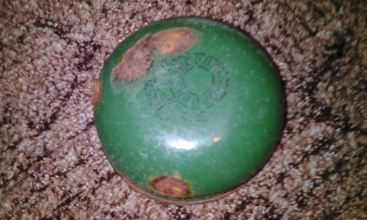 Добрый вечер! Да, соглашусь с Вами. Мне тоже попадалась отдельно ручка - и тоже эмалированная, причём эмаль - зелёного цвета. Я прикидывал, что она, скорее всего, от какого-то черпака, и очень похоже, что это и есть ручка именно к этой чаше. Вот она на фото. Прошу извинить за не очень удачный ракурс, но канцелярская скрепка, лежащая рядом, даст возможность представить размер этой ручки. Если присмотреться, на ручке видны остатки зелёной эмали: Но похоже, что конструкция этого половника изначально оказалась ненадёжной, если нам с Вами черпаки и ручки от него попались не в комплекте, а по отдельности из-за низкого качества крепления.