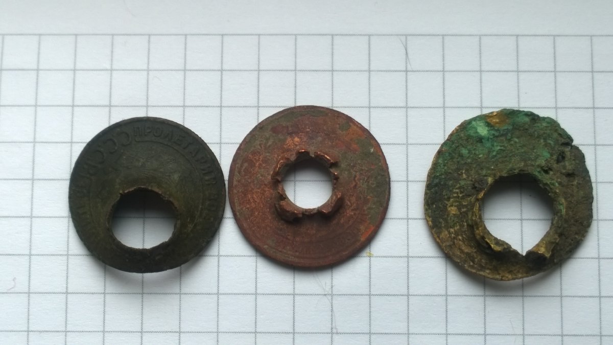 Интересная подборка! Не, ну всё можно понять, монеты-мишени, монеты как заготовки под шайбы, прокладки и др. поделки окопного творчества..... Но вот зачем так сурово обошлись с Николаевской копейкой, вырезав из неё серединку? Может быть, была нужна медная подкладка именно такого размера?
