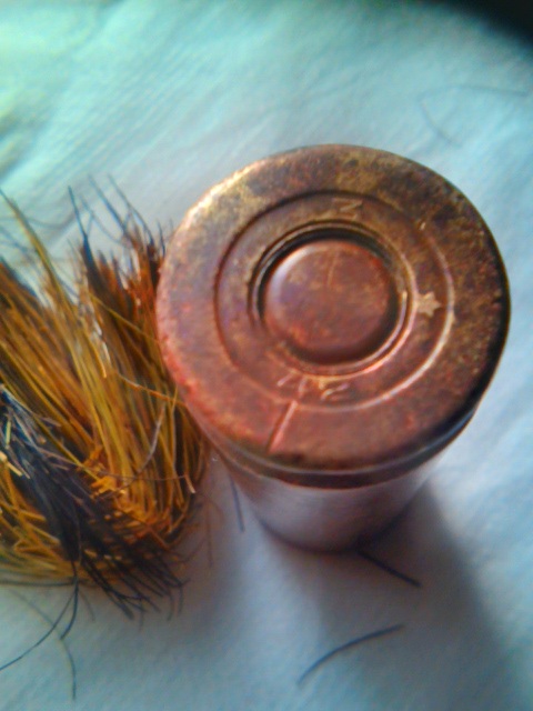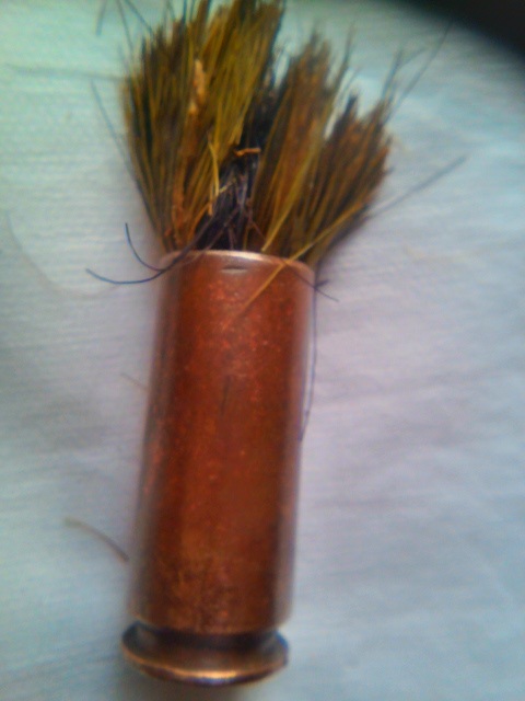 А бывают находки, назначение которых становится понятно только в процессе реставрации. Такая была история с половинкой гильзы от ДШК 12,7 мм. Первоначальный вид имела неказистый, показалось, что забита под завязку землёй и корешками травы. Стал ковырять - ни в какую! Замочил в воде на пол-часа и с большим усилием вытащил щипчиками непонятно что, на клок жесткой шерсти похожее. Промыл, высушил, гильзу начистил как мог. Вначале подумалось, что кисточку для надписей хотели смастерить бойцы-умельцы.... А потом вдруг осенило - да это же ПОМАЗОК для бритья! Щетина сохранилась только та, что была внутри гильзы, снаружи отгнила. Понять бы ещё, с какого зверя щетина пошла на помазок. Уж больно жесткая. С кабана наверное