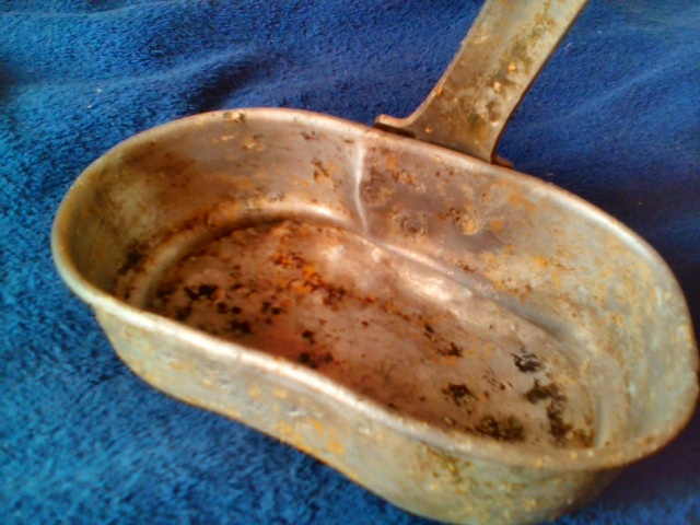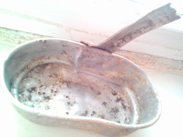 ...как-то давно, по боям 43-го всплыл немецкий котел с ложко-вилкой внутри. (стоЯл почти на бруствере, пробитый осколком)... трудно было повЕрить, но внутри на стенках было что-то вроде остекленевшего комбижира, а на дне остатки перловки...