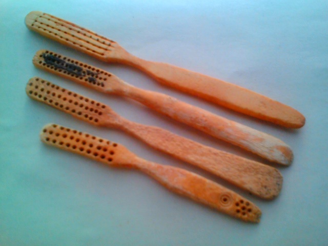 Приветствую всех! Добавляются не только бутылки в коллекцию, но и зубные щётки. Теперь их уже не 3, а целых 4, и все разные: Конечно, на фоне гигиенических шедевров современной стоматологи эти щётки смотрятся как гости из каменного века, но всё же, гигиена в Лагере соблюдалась! Не забывали там и о бритье, о чём свидетельствуют дошедшие до наших дней фрагменты бритвенных принадлежностей: