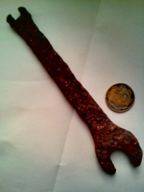 Добрый вечер! В продолжение лагерных находок. Вот такой необычный гаечный ключ. Поржавел сильно , песок, увы, сталь не красит... Не видно ни клейм, ни принадлежности. По замерам примерно можно предположить, что был он "на 13", в крайнем случае на "14". С меньшей стороны - очень похоже под квадратный торец штифта, примерно "на 5". Ну и вот такой арт. предмет, калибр 76 или 75 мм, опять же, ржавчина уже не позволит измерить точно. Внутри пустой почти до донышка, стенки вверху тонкие, около 4 мм, но ближе к низу идёт плавное утолщение, потому как вес достаточно большой - но пришлось добросовестно тащить домой на себе )), всё-таки антуражная штука. Буду реставрировать до вида, приемлемого для просмотра. Если кто в курсе, подскажите пожалуйста назначение этого снаряда - в верхней части не видно резьбы, по которой бы прикручивалась головная часть , видны только два паза-выемки, расположенные друг против друга. И по пояску не понятно - прошёл он по стволу или нет, идёт частая насечка из мелких канавок: