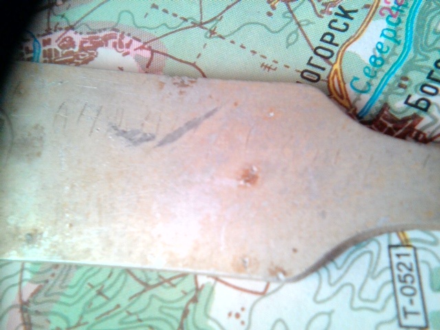 И вот ещё одна находка, из бутылочной тематики. Попался осколок бутылки с необычным клеймом (или фрагментом клейма): По литражу похоже, что бутылка была где-то 0,5-0,6 Л. Дно толстостенное, массивное. Вроде бы пустяковая находка, но у стекла этой бутылки есть одна интересная особенность - им практически невозможно порезаться. Даже самые острые кромки этого осколка на ощупь кажутся притупленными. Был этим обстоятельством сильно удивлён. И даже решился на эксперимент - отбил кусочек боковой стенки (надо сказать, пришлось потрудиться). Кромки свежего скола оказались такими же "безопасными" на ощупь. Окажись такое стекло в руках самоубийцы, решившего порезать им вены, он наверняка бы сильно огорчился. Ещё одна деталь - стекло содержит в себе огромное количество мелких (и покрупнее) пузырьков воздуха. Частично они видны на снимке: