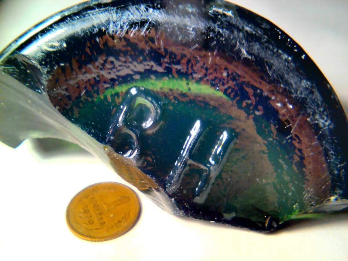 Возвращаюсь к теме стеклянных находок, встречающихся в лагере. Вот одна из версий дизайна первого советского стакана-гранчака. Согласно распространённой легенды, автором дизайна гранёного стакана в 30-е годы была известный скульптор Вера Мухина (автор монумента "Рабочий и колхозница" на ВДНХ) К сожалению, попался только фрагмент стакана, причём этот - самый удачный из нескольких найденных, т.к. на нём наиболее полно сохранилось клеймо: "з-д Артёма" (Артёмовский стекольный завод). Завод, который уже давно не существует. Не совсем понятен логотип завода - вроде похоже на якорь.... или трилистник ?. В более поздние времена вид стакана стал уже не таким агрессивным - рёбра стали более сглаженными, исчезли острые углы в местах перехода рёбер к донцу. Ещё такой интересный нюанс - стекло из которого данный стакан сделан. Его просто опасно держать в руках, кажется малейшее неверное движение и руки будут изрезаны на лоскуты. Все кромки сколов на стекле невероятно острые! Такое впечатление, что держишь в руках ежа.