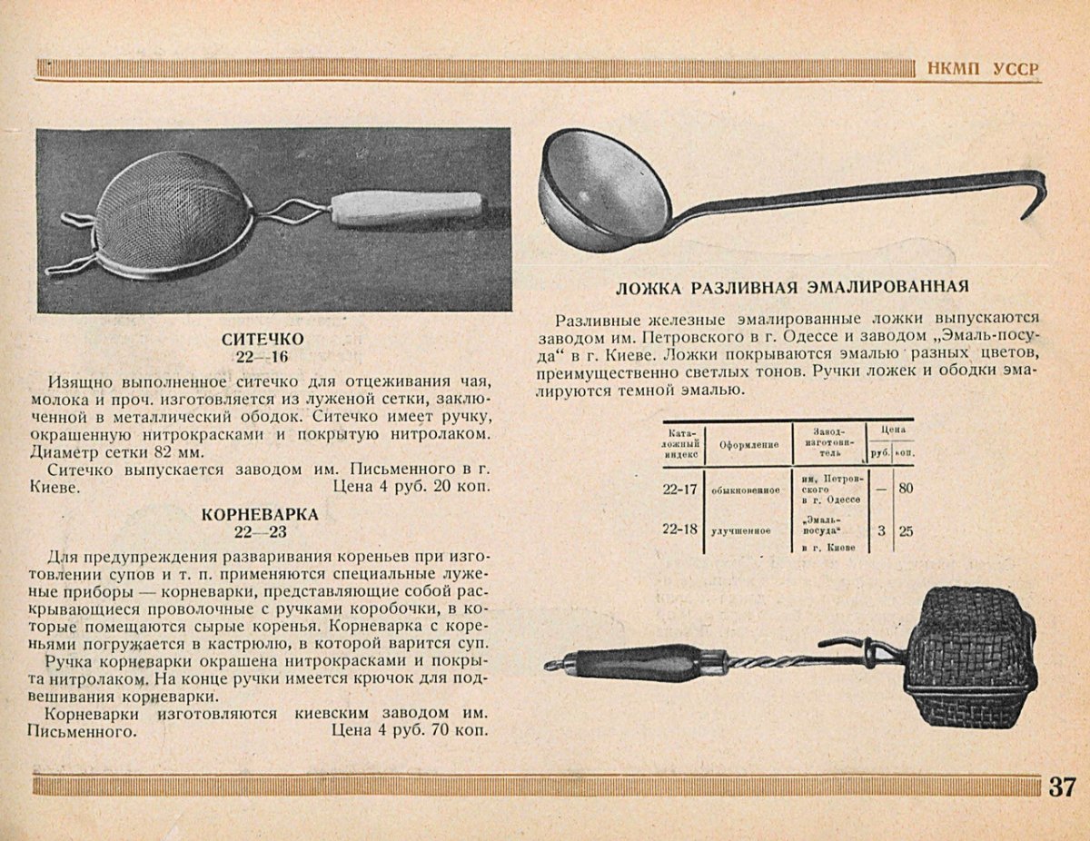 К обсуждению эмалированных черпаков. Каталог предметов домашнего обихода Наркомместпрома УССР 1940 года.