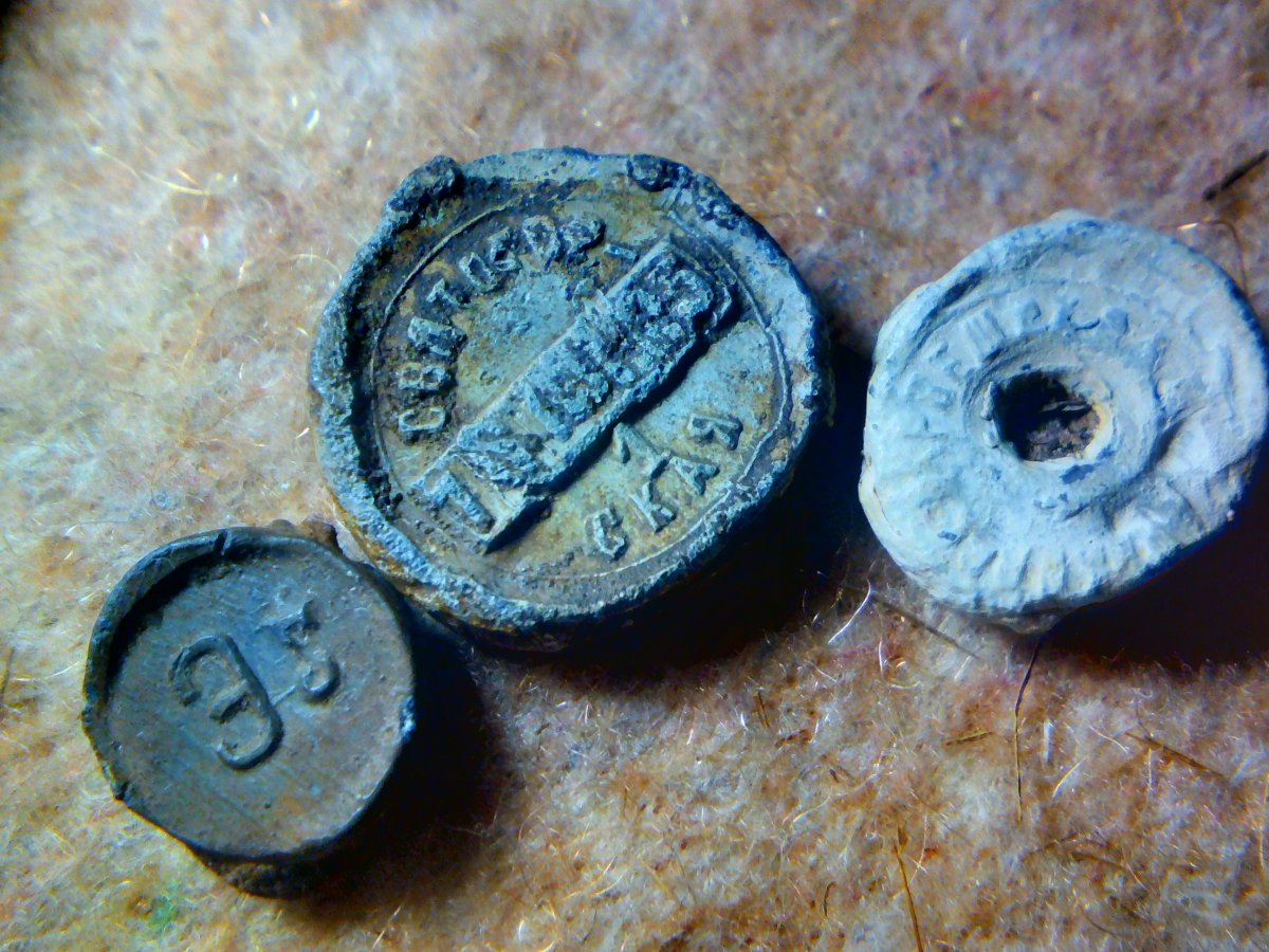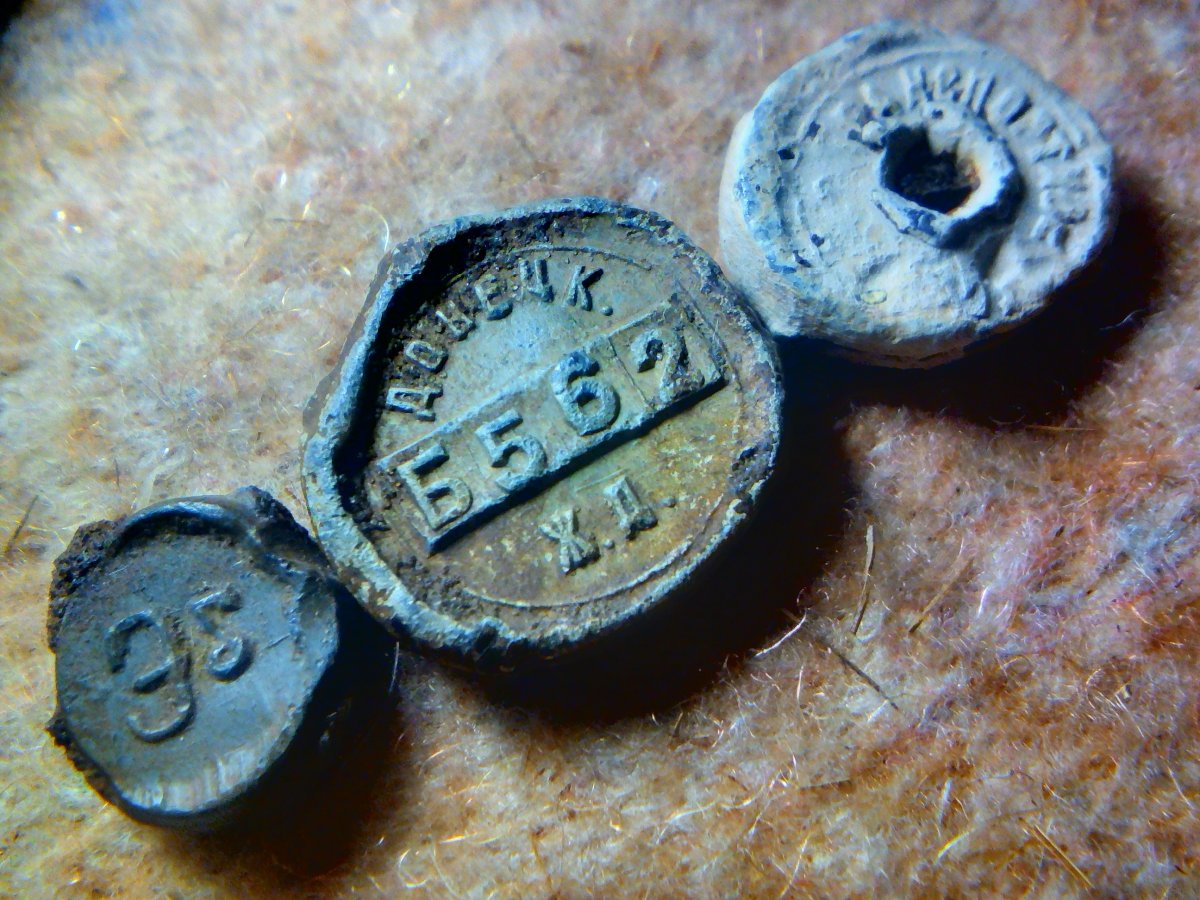Подготовил к публикации несколько свинцовых пломб, найденных в районе Лагеря. Они же, с обратной стороны: Из них, та что средняя - железнодорожная. Донецкая ж/д (год образования 1934 https://www.pz.gov.ua/history?mid=600&lid=1 ) На пломбе стоит дата, последние 2 цифры "35" - 1935 г. скорее всего. Крайняя справа, тоже, скорее всего, железнодорожная - из-за окисления очень плохо сохранился текст. Более-менее читабельно только слово "транспортная". А вот та, что слева, меньшего размера, по ней совсем ничего непонятно: буква Э и рядом какой-то иероглиф, похожий на перевёрнутую цифру "2" или буква "б" прописью . Причём, с обеих сторон пломбы рисунок одинаковый.