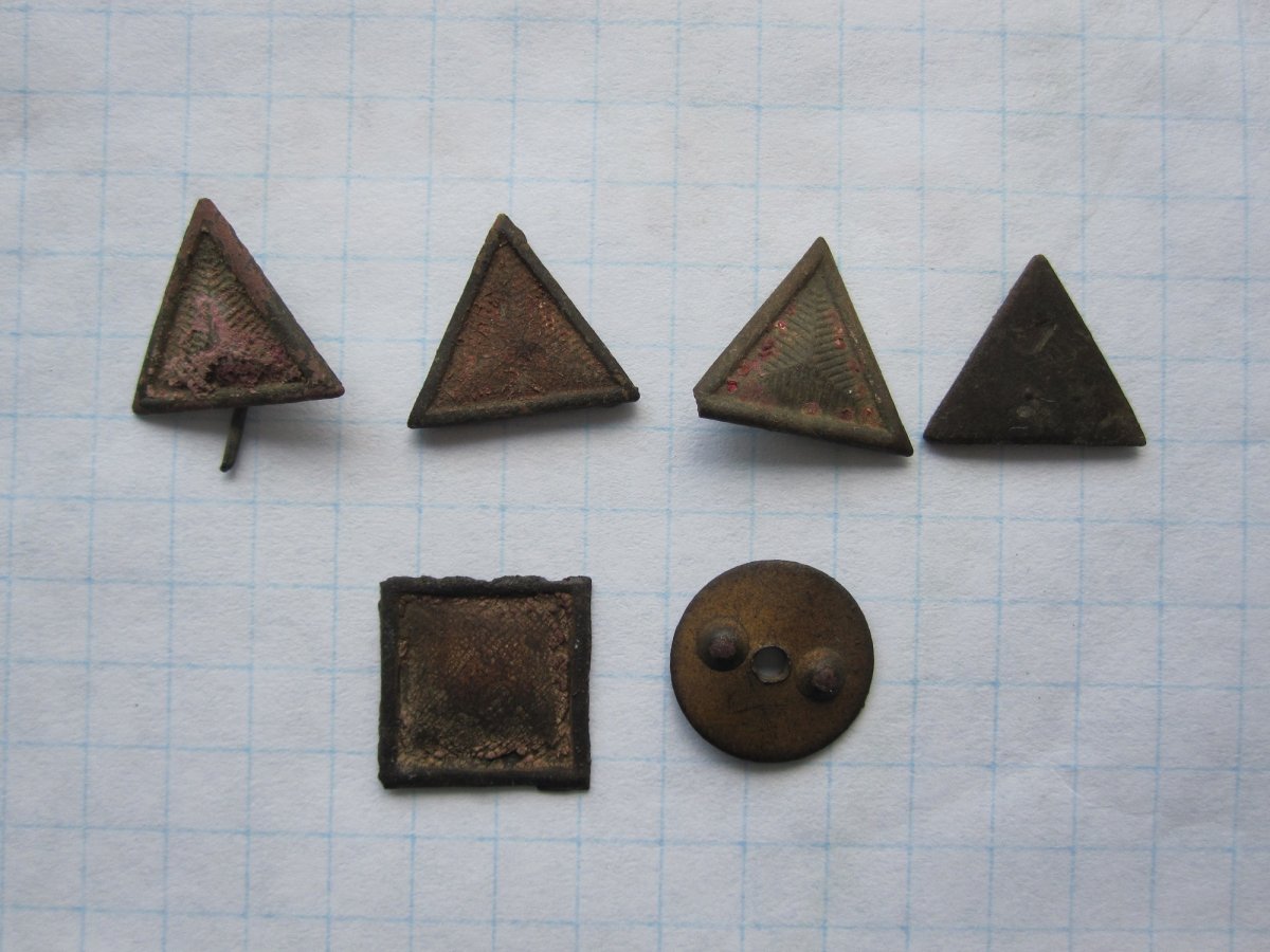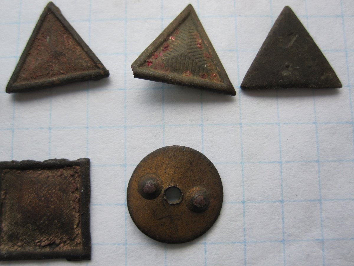 Добрый вечер! И это уже не первый случай находок петличных треугольников ручной работы! Всегда было интересно - они делались солдатами "для форса" (типа на дембель, как и ручное изготовление латунных букв на погоны в поздней Сов.Армии), или же их делали в силу суровой необходимости из-за утраты уставных фабричных треугольников? Закрутка может быть и от комсомольского значка?