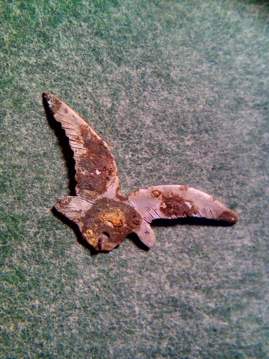 И в продолжение вчерашнего разговора о самодельных петличных знаках различия. Было подозрение, что вот эта птичка - тоже вариант окопного творчества, только на этот раз солдат люфтваффе. Как вариант - взамен утерянной форменной эмблемы с петлицы. Сделана, похоже, из дюрали: Сильные сомнения так и не развеялись, поскольку сходство этой находки с оригиналом петличной эмблемы люфтваффе очень условное. Если по самодельным "треугольникам" РККА геометрическое сходство практически полное, то здесь всё намного сложнее... И всё же, какие будут мнения по целевому назначению этой рукодельной птички (3 верхних фото)? Был ли это просто рукодельный значок для ношения на гражданской одежде, наподобие вот этого: Или всё-таки "птичка" имела какое-то отношение к фурнитуре, хотя и самодельной?