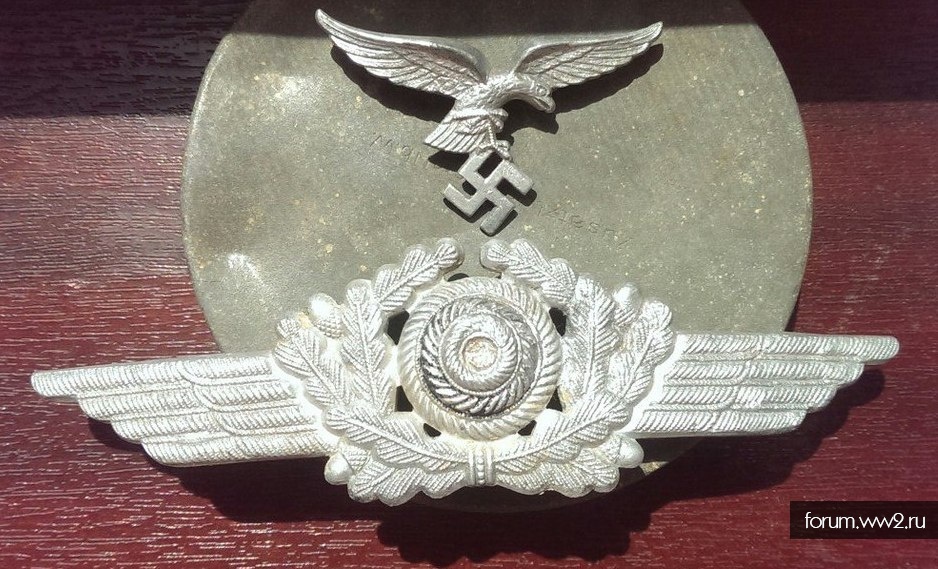 В принципе, да, согласен. Силуэт этой птички очень напоминает если не петличный знак люфтваффе, то как минимум имеет сходство с эмблемой на головной убор рядового и унтер-офицерского состава немецких летунов: Или с эмблемой со значка-фрачника: Во всяком случае, мастера, который изготовил эту штуку могли вдохновлять на творчество именно эти эмблемы. Очень многое говорит за то, что творивший этот брелок неоднократно видел сам ОРИГИНАЛ и из головы ничего не выдумывал. И уж точно он не Голубя мира создавал! ? Но кем был этот мастер по происхождению, немец, ...или кто из наших сподобился (кстати, вполне кто-то мог и из наших гражданских сделать, в суровое сразу послевоенное время, когда фабричных украшений не хватало, а носить открыто значок Люфтваффе было равносильно смертному приговору)... Вопрос остаётся открытым.