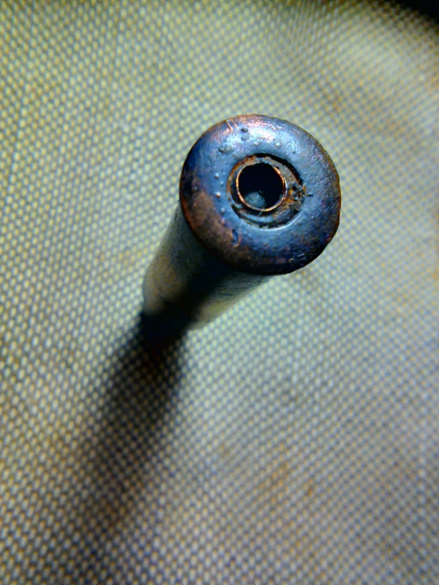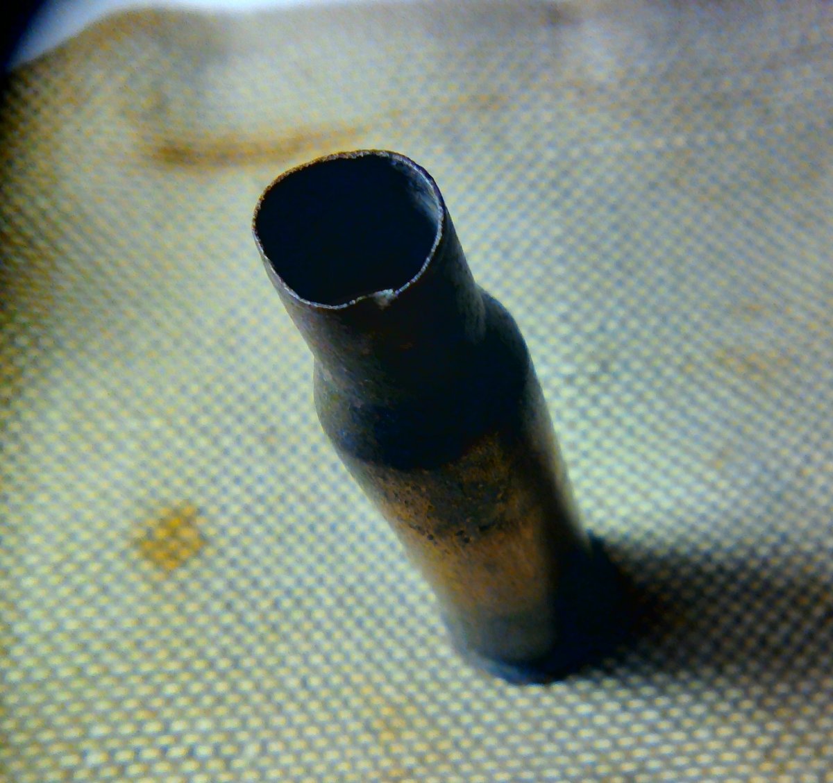 Мне тоже трижды попадались (в разное время и в разных местах лагеря) гильзы с такими странными пробоями-"вывертами", сделанными как бы ИЗНУТРИ . И все три случая это были "мосинские" гильзы. Вот одна из них, которая сейчас наскоро попалась под руку: на двух других ТАКИХ разрушений капсюля нет. Дульце этой гильзы имеет нарушения геометрии и забоину, которые образовались явно ещё в лагерные времена: На двух других мосинках на капсюле нет ТАКИХ разрушений, но тоже видна "работа" изнутри. Версия насчет детских шалостей, описанных камрадом GINDENBURG в детальных подробностях, не выглядит такой уж невероятной - во времена лагеря, в 30-е годы, неподалёку находился пионерлагерь для детей комсостава дивизии. Информация про этот лагерь абсолютно достоверная, неоднократно описывалась в воспоминаниях, имеющихся в интернете. Возможно, что и пионерам 30-х годов такие шалости были не чужды Но может быть кто-то выдвинет и другие версии про удар бойка "изнутри"?