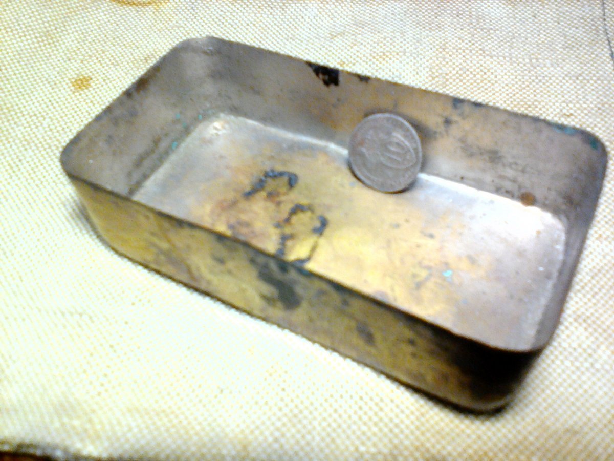 Ну и вот такой латунный коробок (возможно, рондолевый:rolleyes:). Удивил сохран латуни - на фото коробок после бани с хоз.мылом и жёсткой кухонной губкой. После того, как нестойкая патина была удалена губкой, появился устойчивый латунный блеск практически без пятен "красноты" :