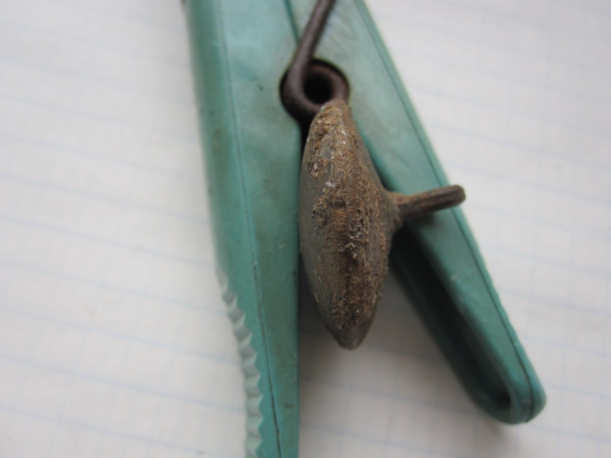 Помыл мылом с зубной щеткой. Клейм нет. Спереди возможно не завальцовка - а просто кант. Вокруг ушка - железо ,диаметром примерно 8 мм. Материал пуги возможно и не бронза -латунь , (подозрительно выглядит - цвет ровный однотонный ,матовый). Вроде бы по лендлизу поставлялись пуги в ркка из бакелита ??