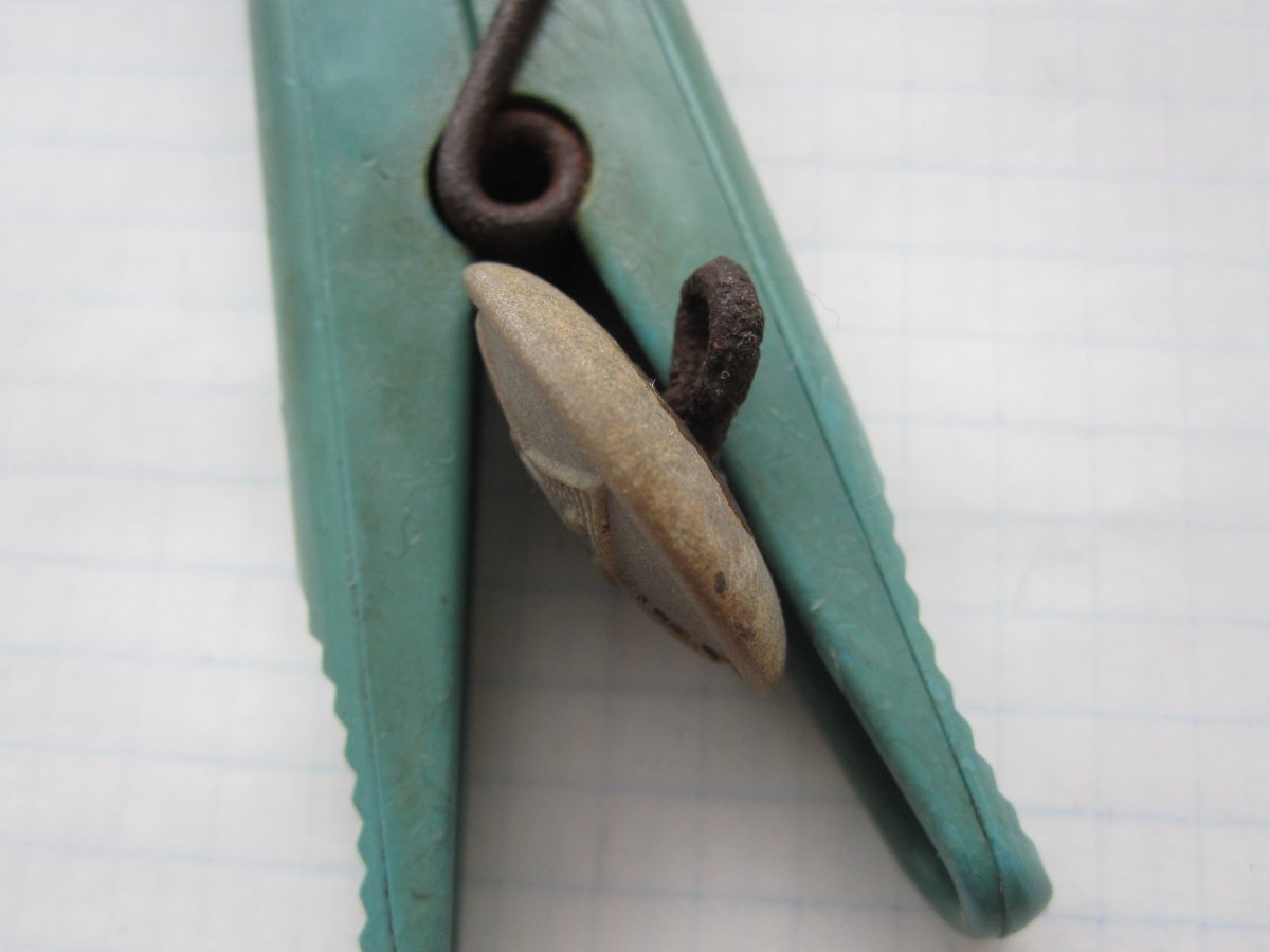 Вот всё и прояснилось: пуговица штампована из пластмассы, а ушко у неё стальное. А мы тут гадали, как соединены латунные части.