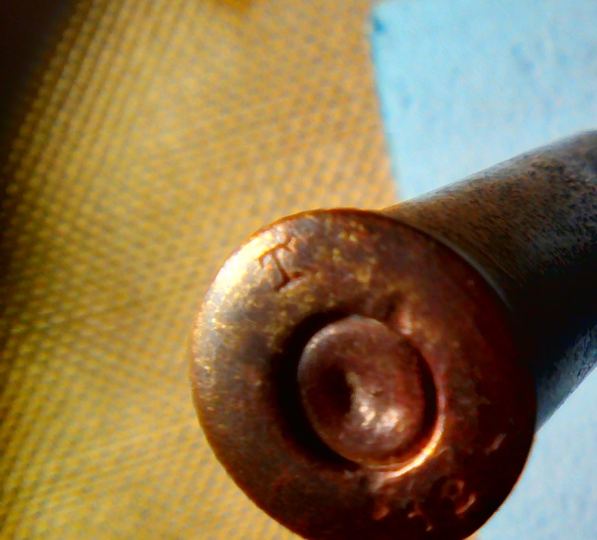 Нет, попалась тульская гильза нагана 1918 года, уже была с клеймом: Но, похоже, что наступившее в тот момент в Российской империи Смутное Время, сказалось на качестве металла - на дульце гильзы специфическая расширяющаяся трещина, которая образовалась в момент выстрела: