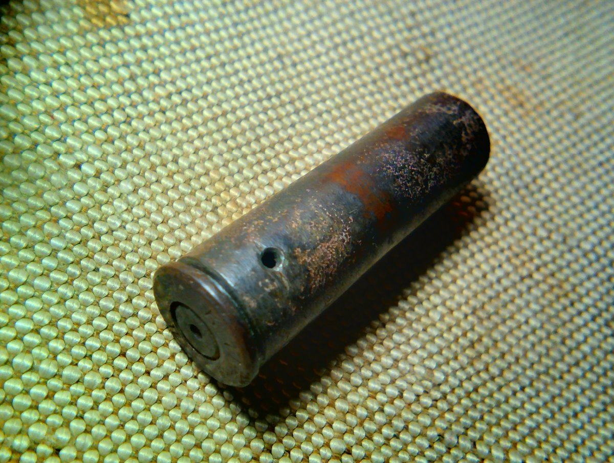Ещё немного о лагерных находках с "человеческим фактором". Очень нравится такие непонятности изучать и рассматривать. Гильза от нагана (выпуск 1931 г.) была аккуратно заткнута самодельным пыжом, свёрнутым из плотной бумаги. После извлечения этого пыжа, из гильзы выпали сухие и почерневшие куски "мумии" какого-то насекомого, не понятно зачем заточенного в этой "капсуле времени".... Вот такие занятия на досуге бывали у служивых в лагере